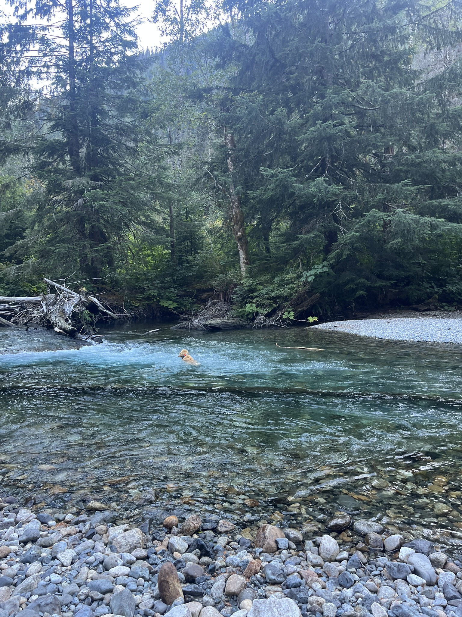 The Middle Fork Snoqualmie was running turquoise and cold and perfect. I was in it before we'd covered a mile. Couldn't help it. Old-growth forest pressing in from both sides, the air thick with cedar and wet stone and whatever had walked through here before us. That valley smells untouched. I caught deer musk and something sharper — maybe cat — on a log near the river. I stopped and held the scent for a long time, reading it. My human didn't notice until I froze. Then he looked where I looked. That's how it works between us.