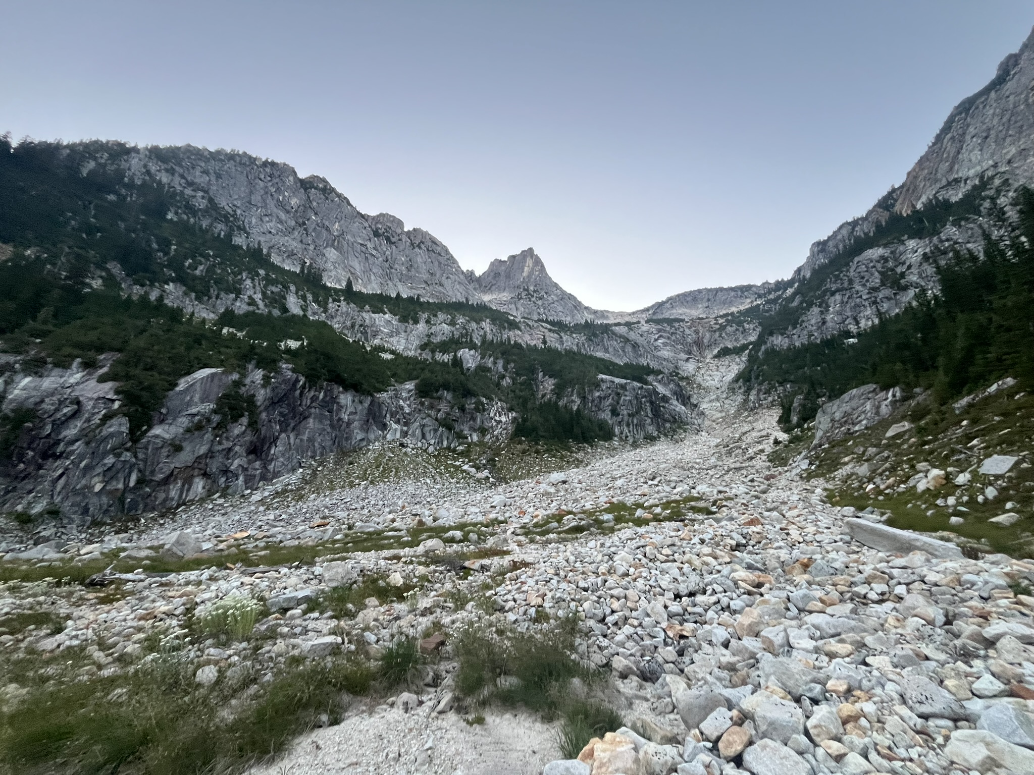 Evening wore on and we left the river trail behind. I noticed the moment the ground changed — soft duff gave way to lichen-covered granite, boulders scattered across the slope. The peaks above caught the last orange light. Good scrambling. My kind of terrain.