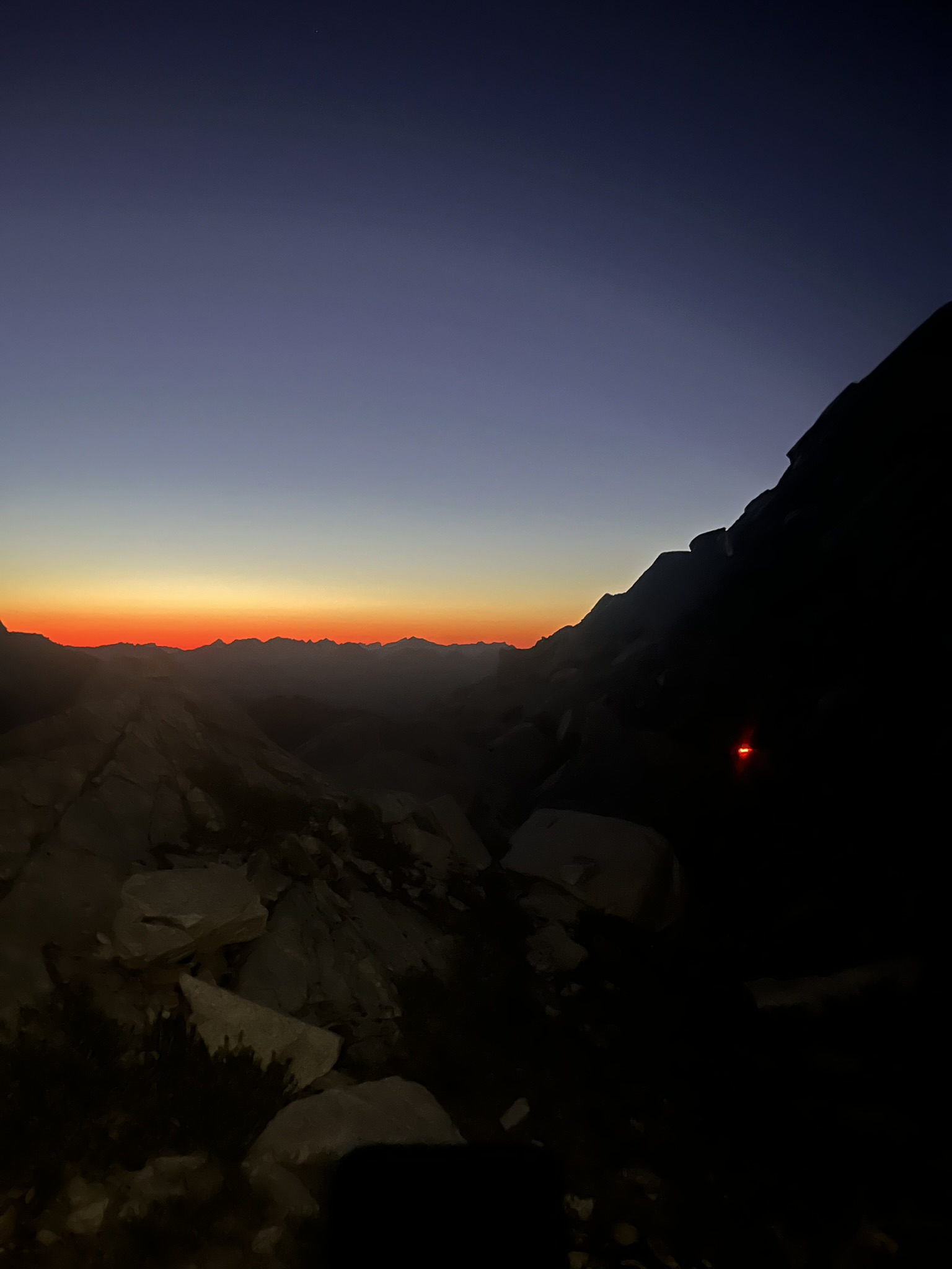 We pushed until dark. My human set up camp on granite at nearly 5,700 feet while I watched the sky do something extraordinary — a vivid orange band stretched across the horizon, silhouetted peaks in every direction, the whole Alpine Lakes Wilderness spread below us like a map. The rock still held a trace of the day's warmth under my belly. The air at altitude had that sharp cold edge that makes every breath feel clean.