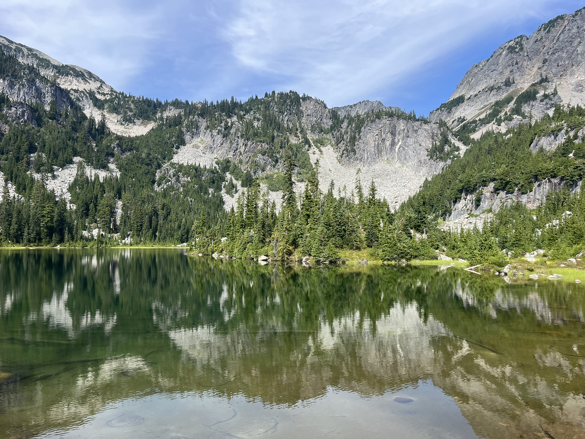 We dropped to a large lake — deep blue, backed by a steep rock wall, sun streaming across the surface. I found the shore and waded in to my chest. The water was so cold it made my teeth ache. Obviously I stayed in.