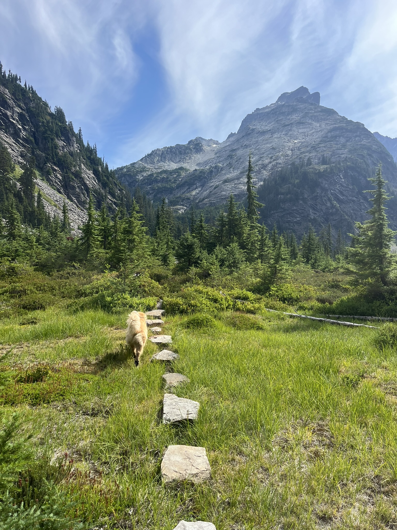 I led the way across stepping stones through a lush green meadow, a rugged peak rising ahead, the subalpine stretching around us. My paws knew exactly where to land. They always do.