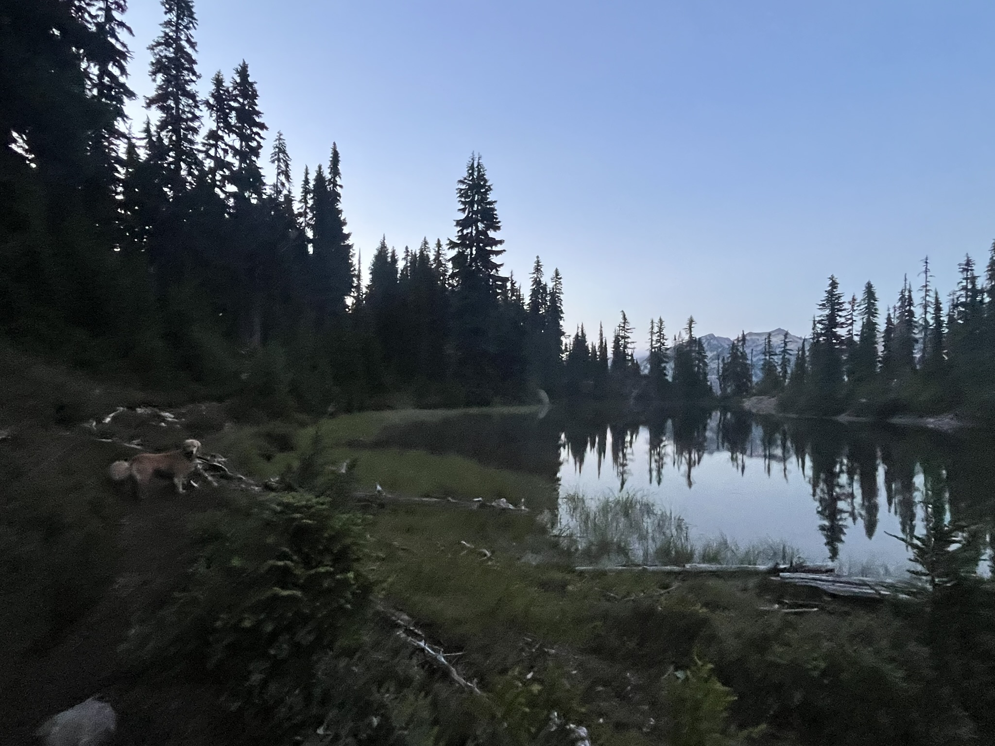 We passed a lake on the approach — dead still, conifers reflected on the surface, a peak glowing above the treeline. I paused at the shore. Briefly interested. But the water smelled shallow and weedy and we had miles left, so I kept moving.