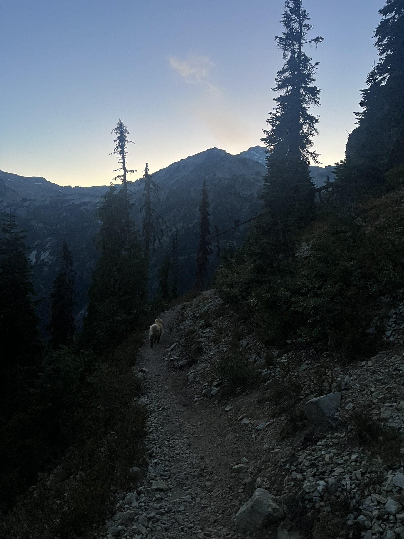 We left Tucquala Meadows around 7 PM on a Friday in mid-August. My human had that after-work energy — tight jaw, fast pace. I matched it. The trail climbed through forest, then broke into alpine meadows as the light shifted to blue. Mount Daniel's bulk sat ahead through the trees, snow and rock catching the last color. I could smell the glacier from here. Cold mineral air, snowmelt, something ancient.