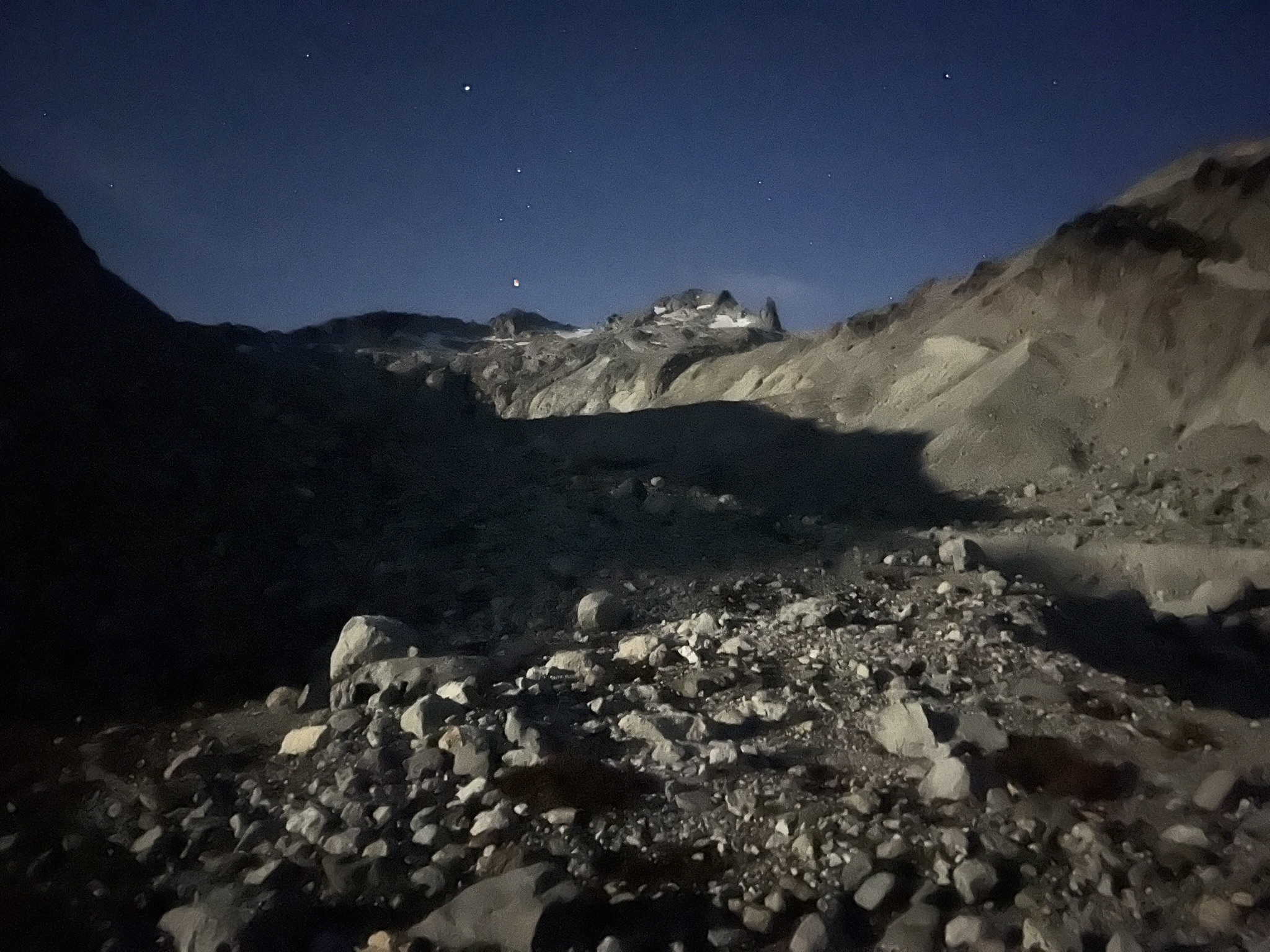 Camp went up at the edge of the Daniel Glacier moraine, where the forest gives way to rubble and the cirque opens its mouth. By 10 PM — full dark, stars overhead, the glacier and summit ridge glowing pale in the moonlight. The only sound was meltwater running somewhere below us in the rock. I curled up on a flat spot and listened to the mountain breathe. Something moved in the talus below us — too heavy for a marmot, too quiet for a deer. I lifted my head and held still. My human was already asleep. I kept one ear on it until the sound faded up the moraine and away. Whatever it was, it had its own business tonight. I let it go.