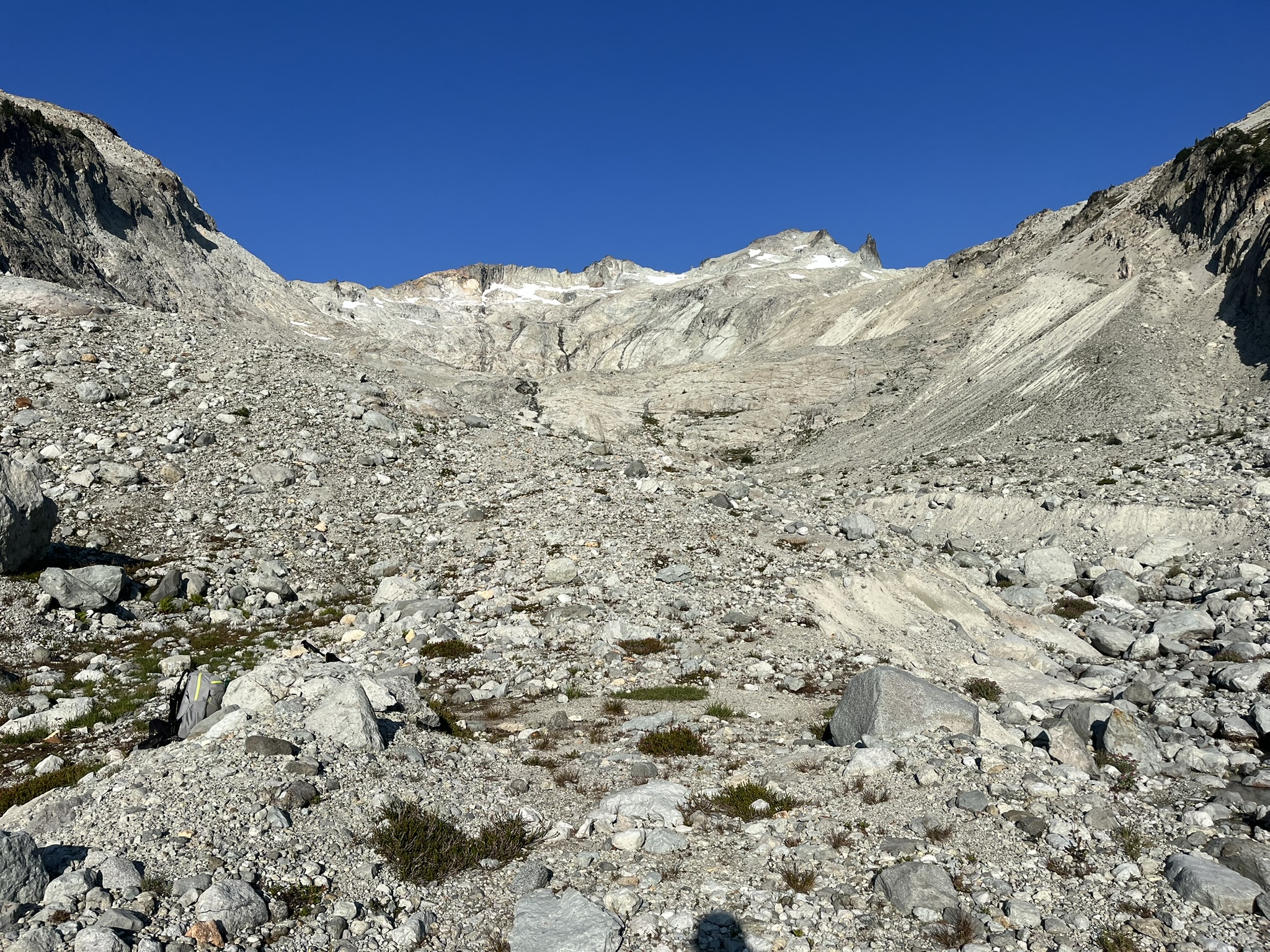 Morning showed me what we'd slept beneath. The Daniel Glacier cirque — a massive amphitheater of rubble, polished rock, and lingering snow, the summit hidden somewhere above the headwall. The scale of it hit my nose before my eyes: cold air pouring down from the ice, stone dust, the sharp clean nothing of altitude. I stood in the moraine and let it settle over me.