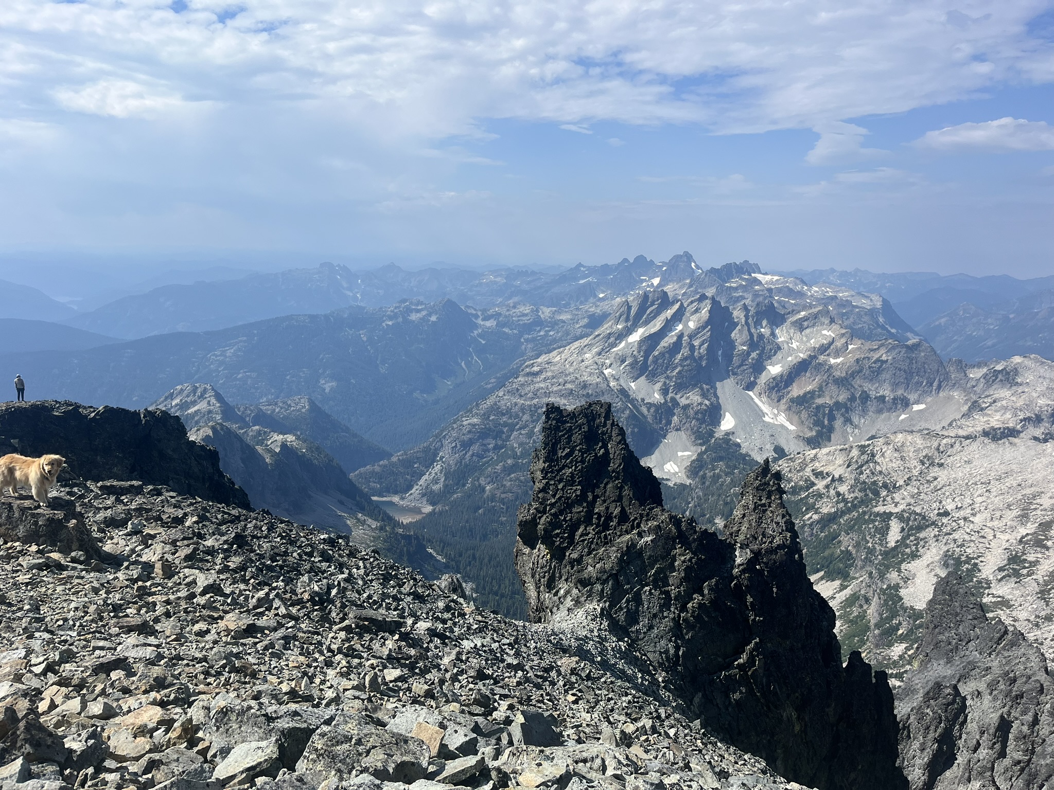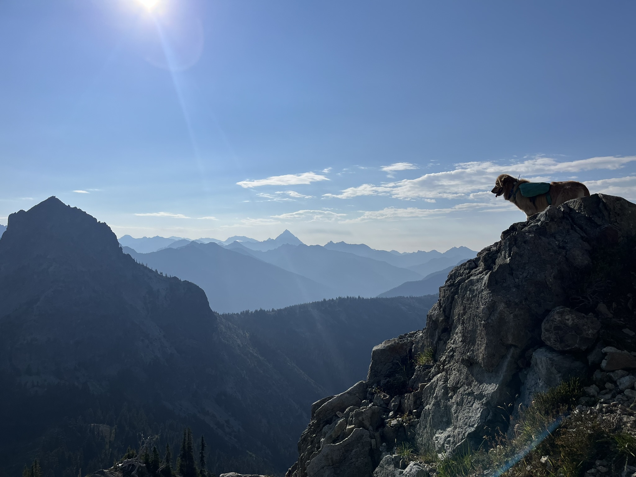 We climbed. By 6,400 feet the world was all rock and air. I stood on an outcrop with the morning sun behind me — layer after layer of smoky Cascade ridges fading into haze in every direction. The wind pressed my ears flat. Below us, everything.