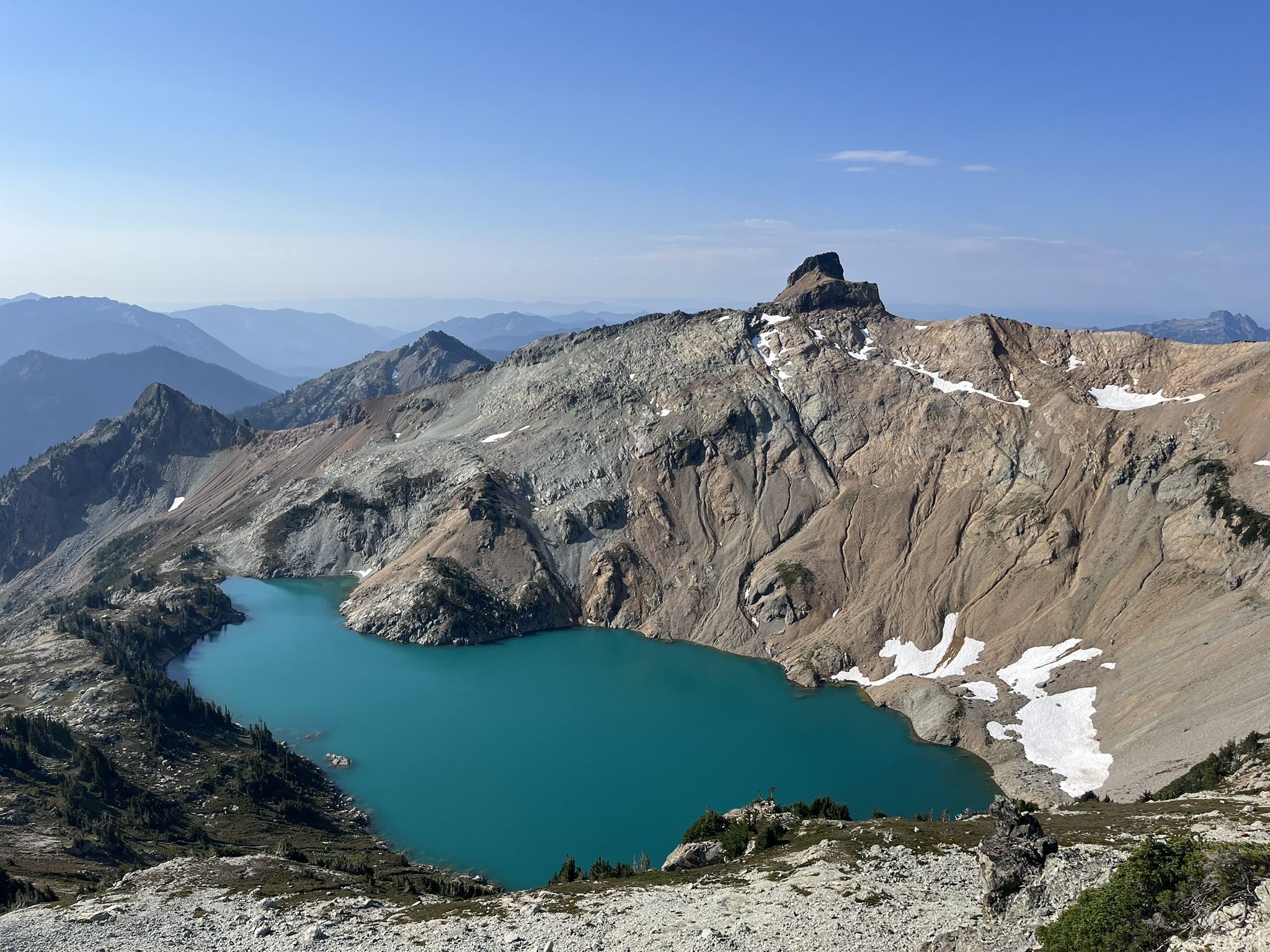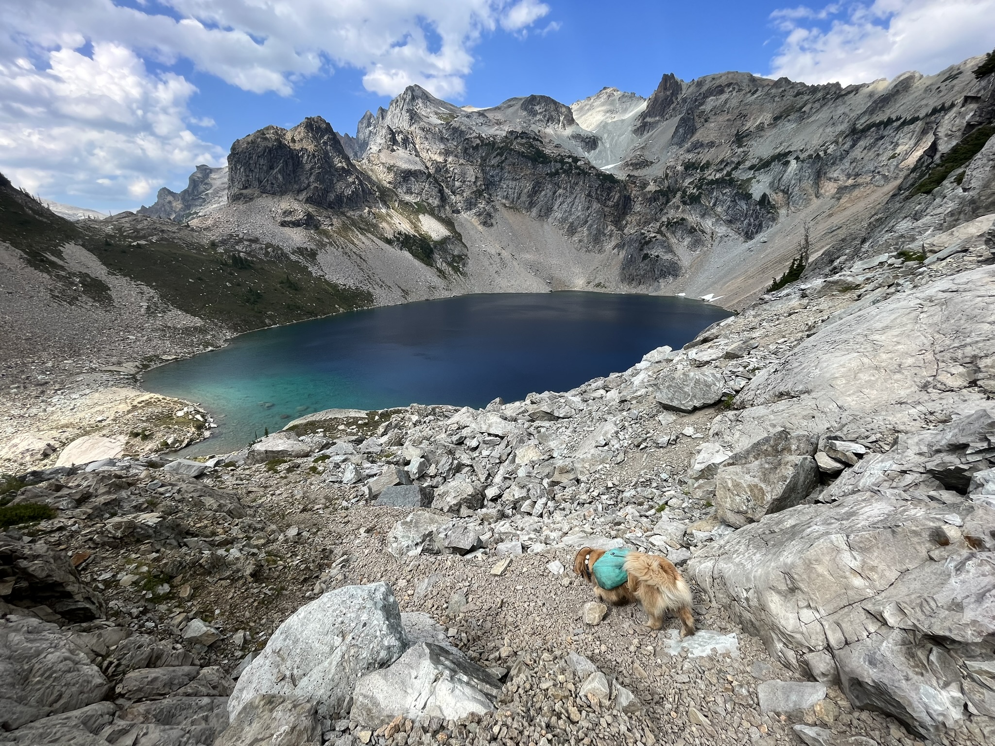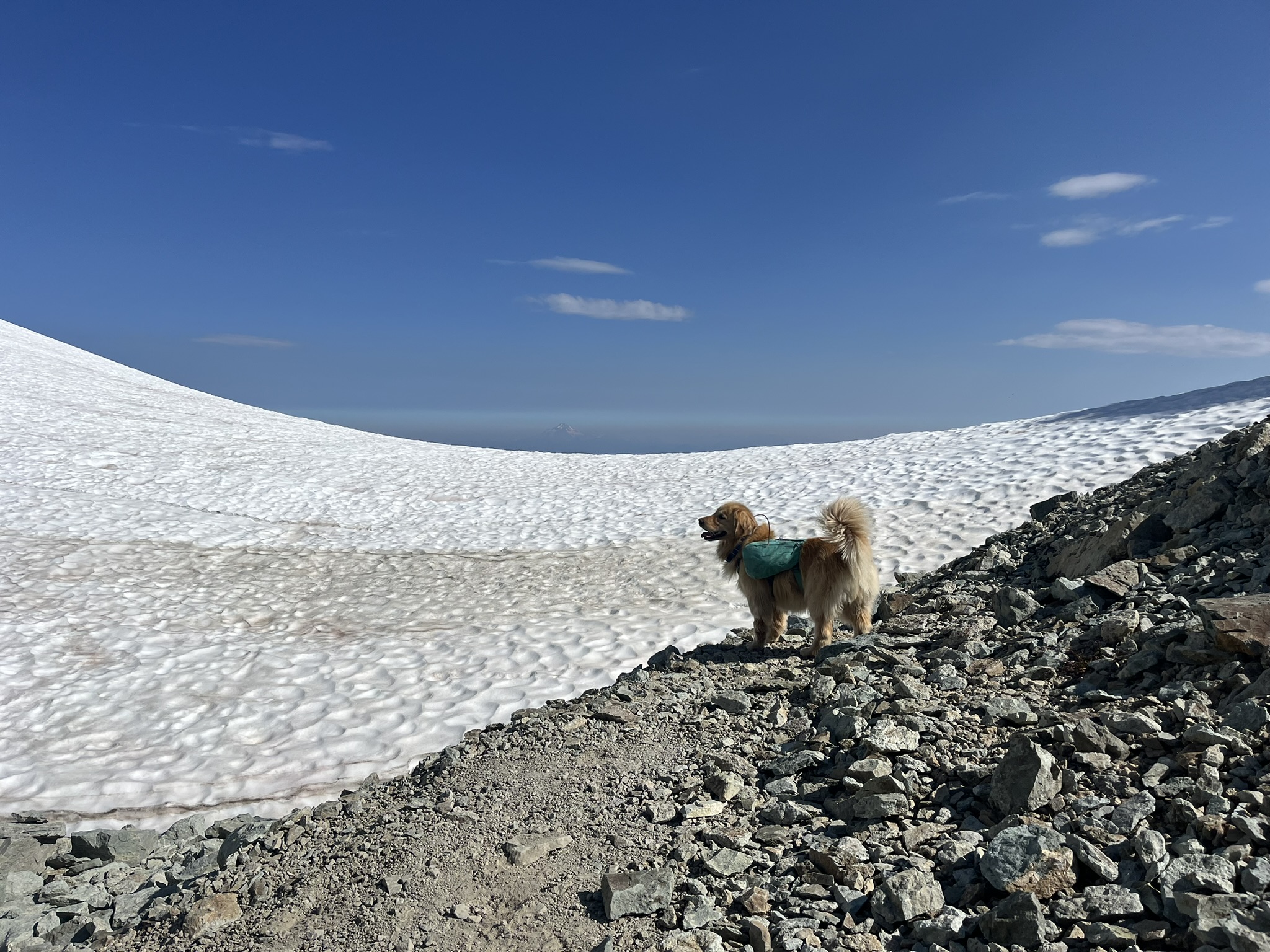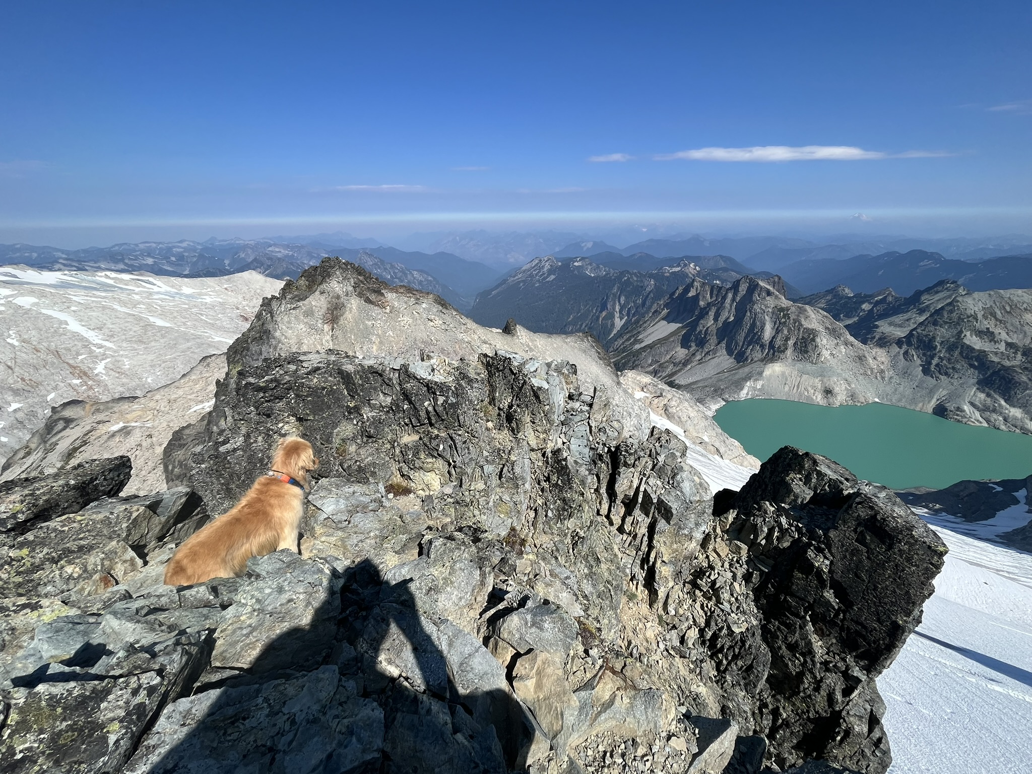 Then we were there. 7,958 feet. The summit ridge of Mount Daniel, the highest point in King County. I sat on the exposed rock and looked out over the glacier and the lake below. No pack, no leash. Just me on top of a mountain, the wind lifting my fur, the whole Cascades laid out in every direction. This is what I'm built for.