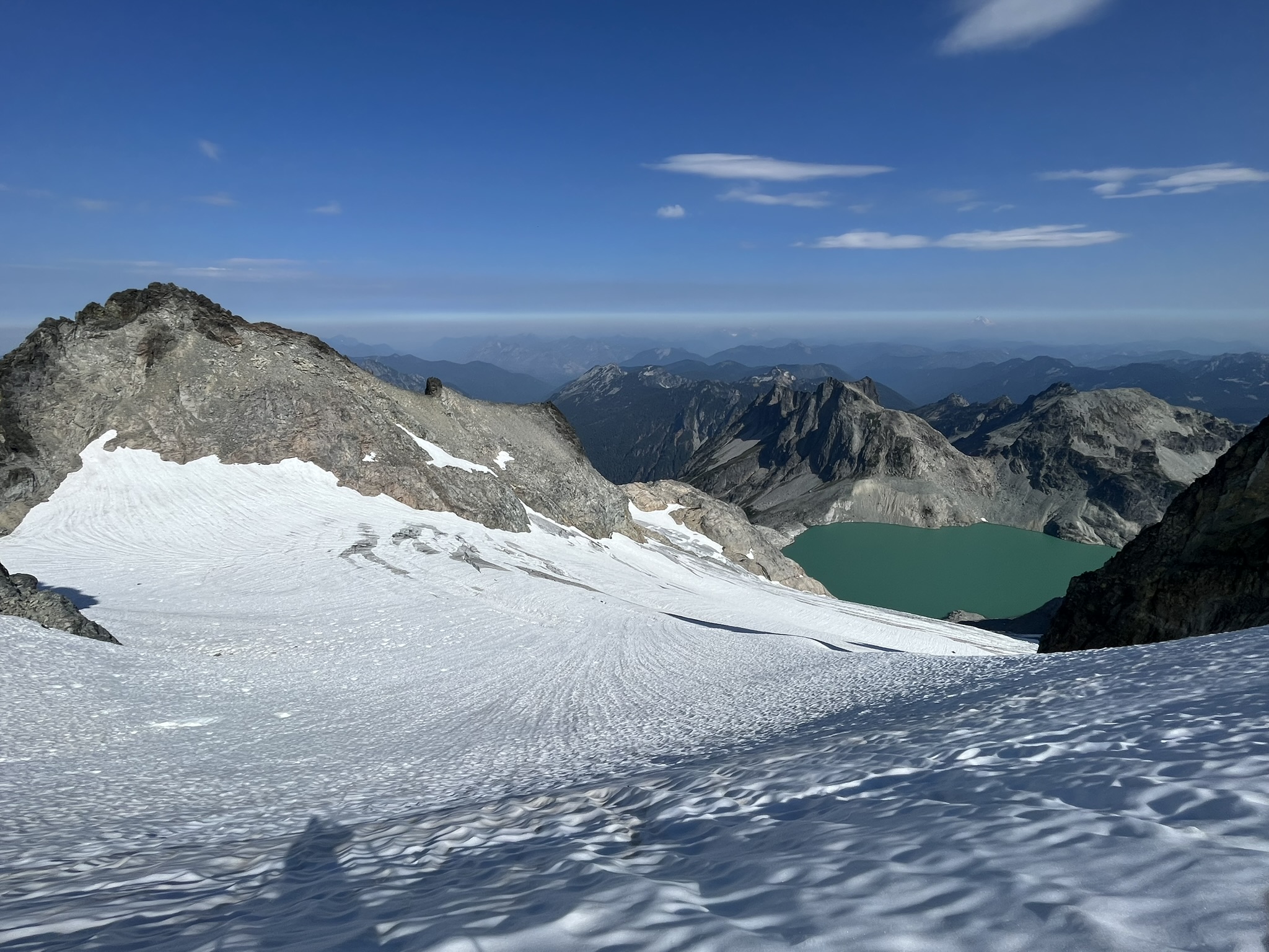 The plan had been to descend the Lynch Glacier directly — straight down the snowfield we'd been staring at all morning. But from the summit ridge, it looked wrong. Too open. Crevasse risk, bad runout, no good options if things went sideways. My human made the right call. We reversed back toward Circle Lake and cut south instead, picking up the circumnavigation route toward Venus Lake.