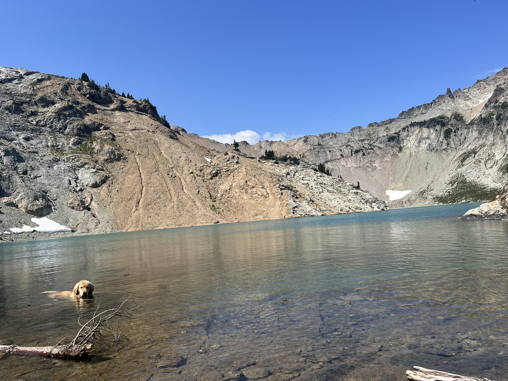 The detour added miles but the terrain was beautiful. And — more importantly — there was swimming. I found a lake along the way, turquoise and cold, the cirque walls warm with color in the midday sun. I swam with just my head above the surface and let the cold press into every part of me.