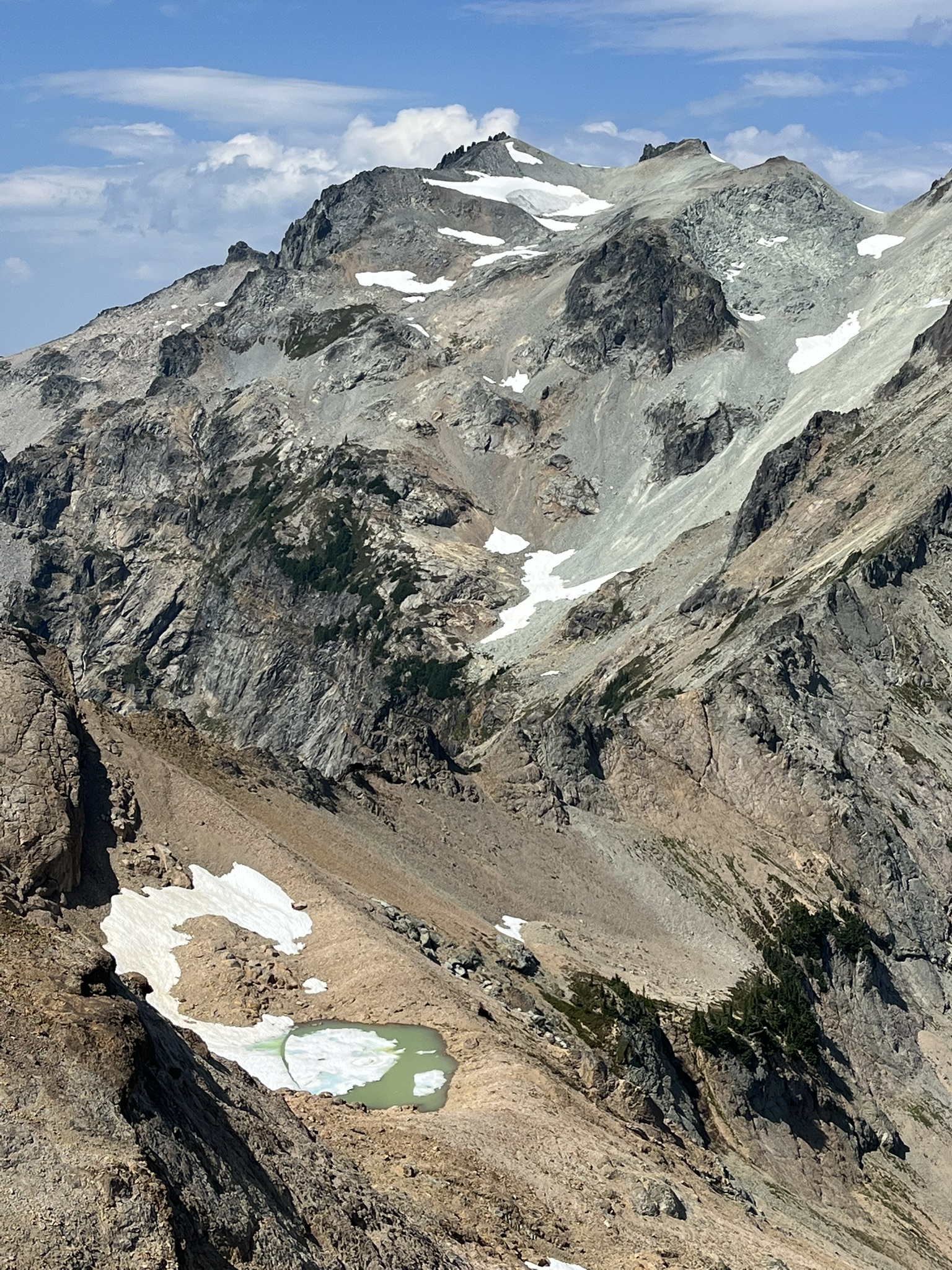Looking back at Daniel from the south, the mountain was a stranger. A massive dark bulk with snow patches and talus, a small green tarn at its feet. Clouds building above. The wind had shifted and I could smell weather coming.