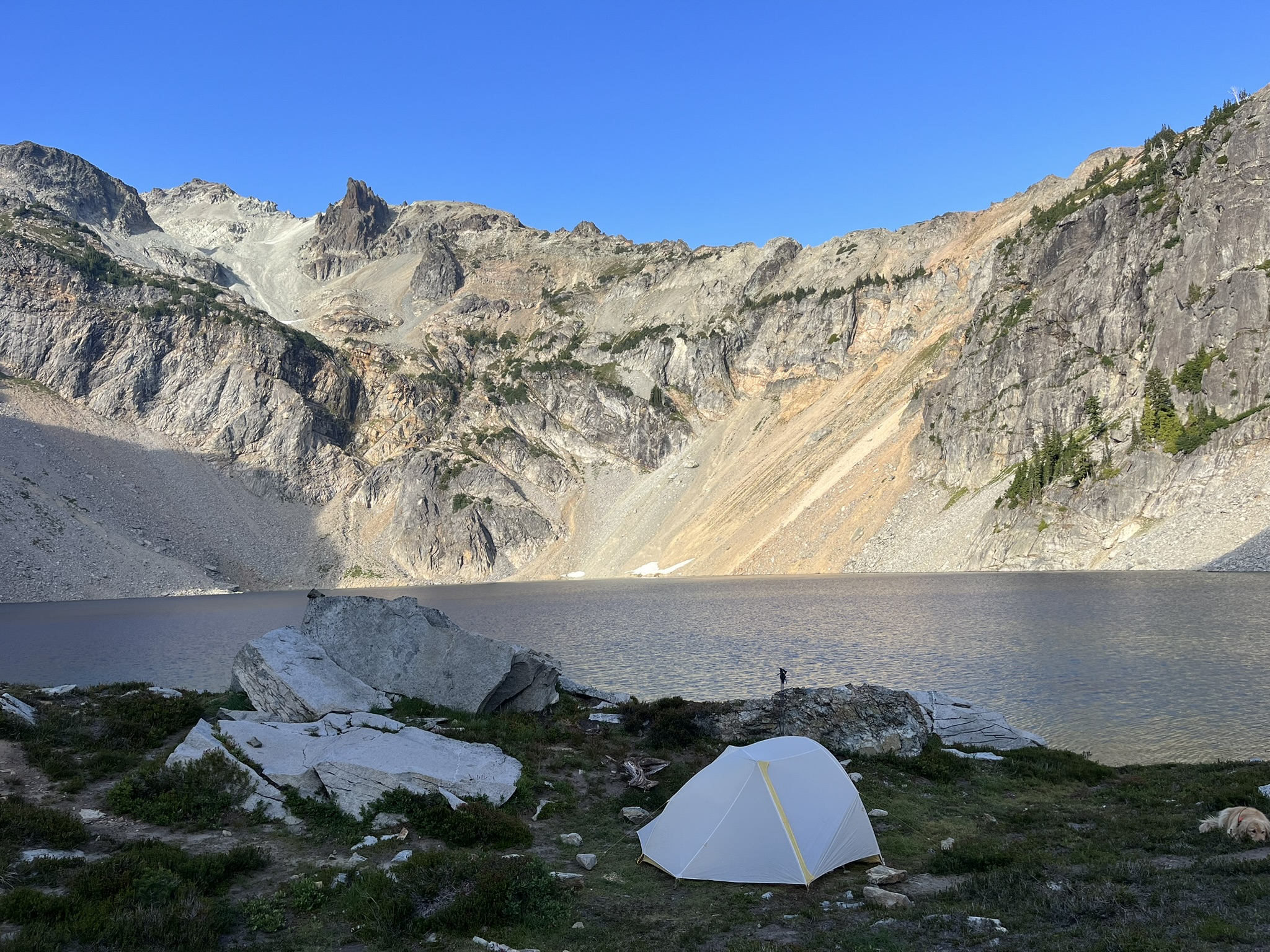 The tent went up on a grassy shelf at the water's edge. Behind Venus Lake, the headwall — hundreds of feet of sheer rock face rising straight from talus, orange and gray and black. The kind of wall that makes you step back and look up even if you've been staring at mountains all day.