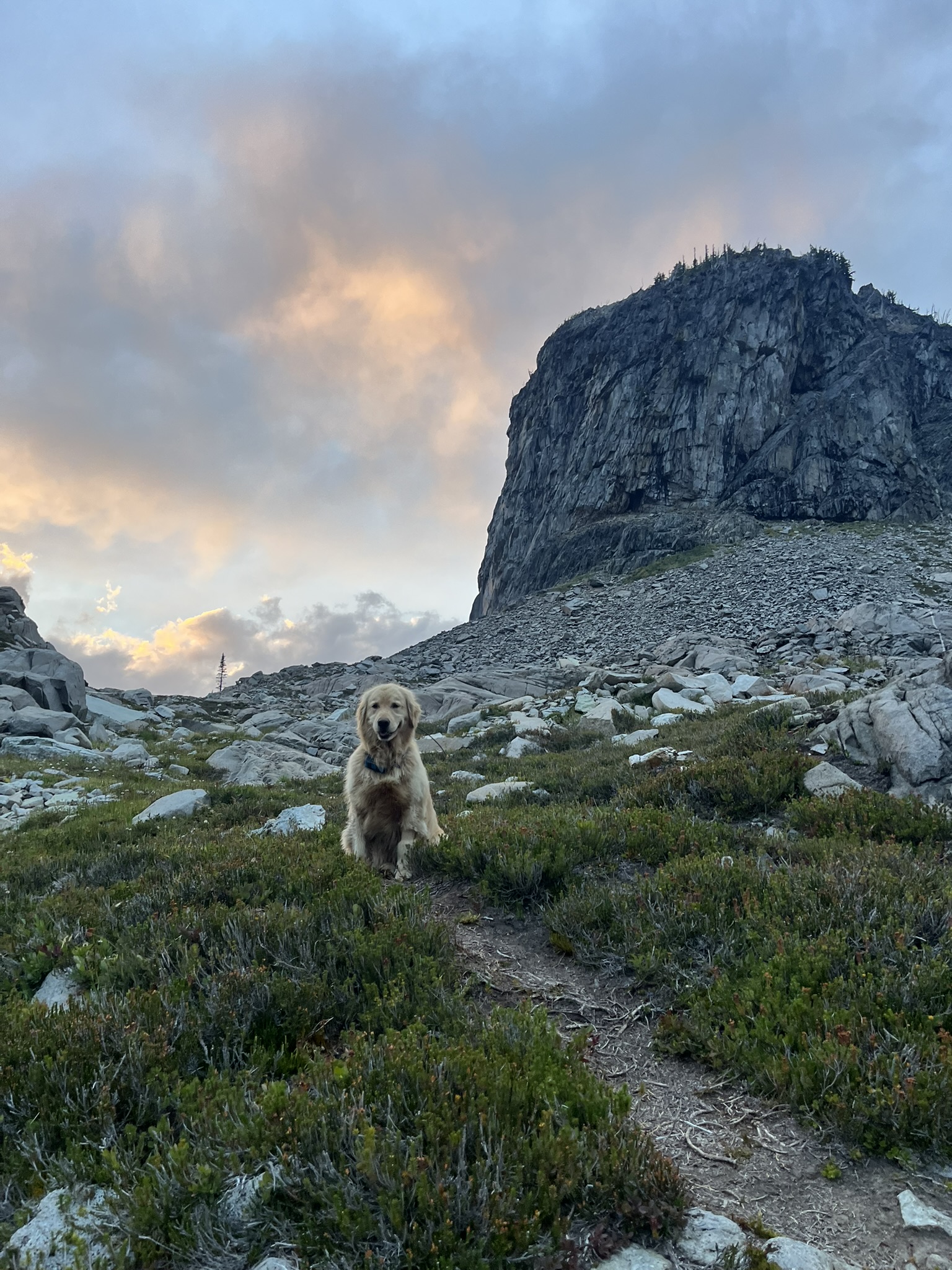 The light went soft and pink. I walked toward my human on a path through alpine heather, a massive dark buttress rising behind me, sunset clouds glowing warm above it. He had the camera out. Obviously.