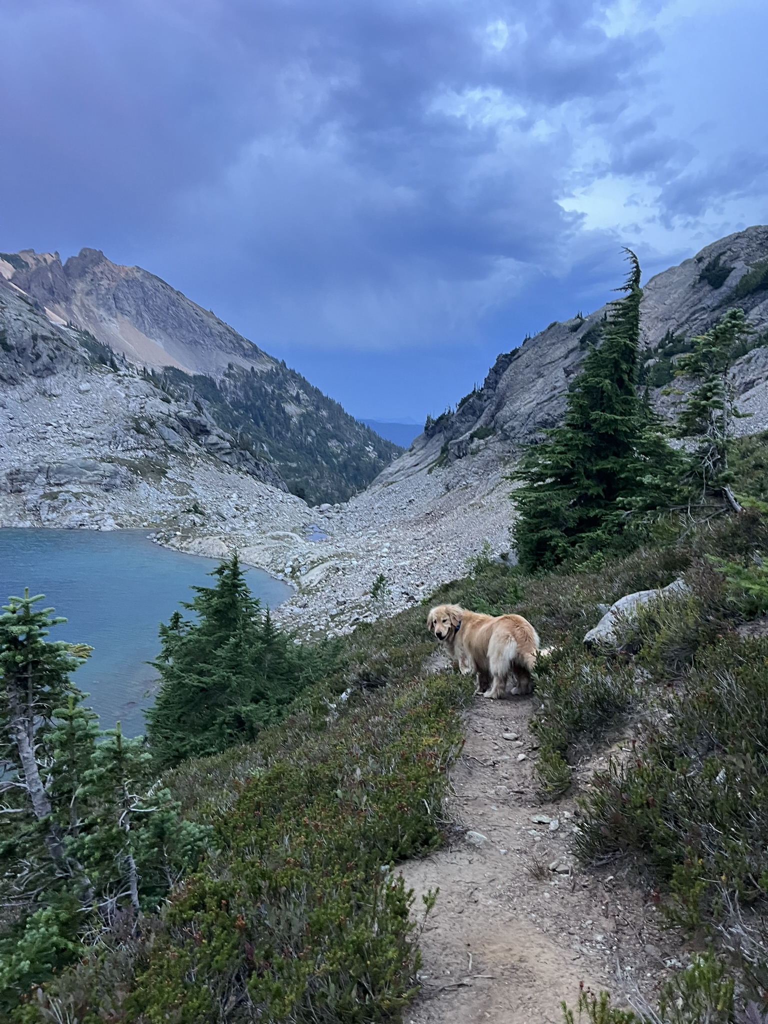 We dropped back toward camp as the color faded. I walked the trail above Venus Lake — the water still and turquoise below, the cirque walls closing in, the sky going blue and gray. The evening smelled like cooling rock and the sharp green of wet heather.