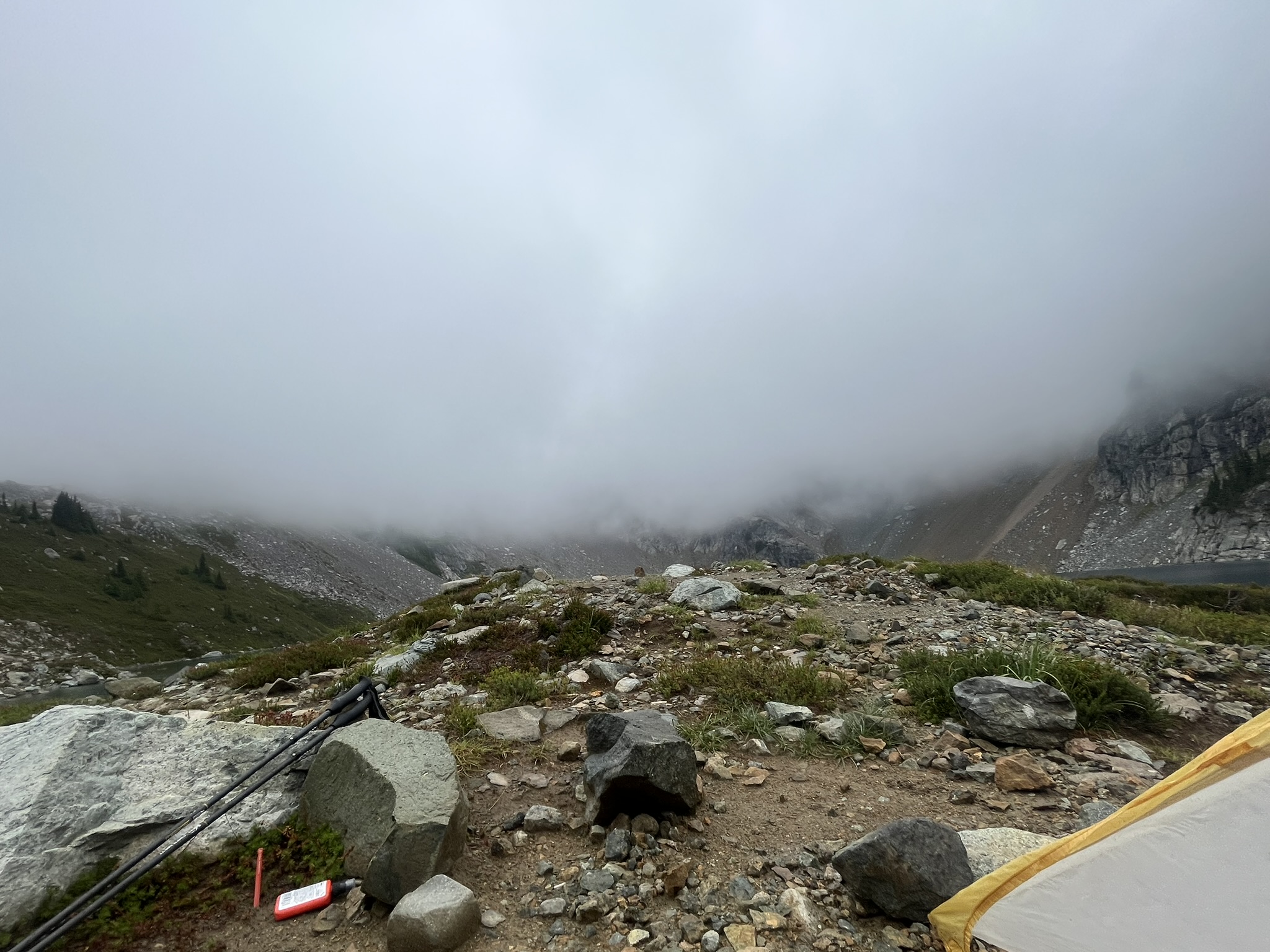 We woke to nothing. The cirque walls had vanished — just gray mist where the headwall had been, the lake invisible, the world reduced to ten feet of wet rock and dripping heather. Trekking poles leaned against the tent. The mountains would come back when they were ready.