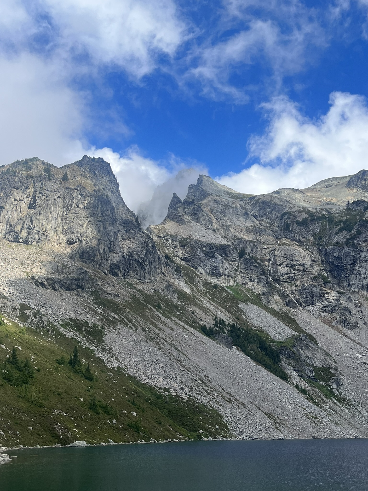 By mid-morning the fog started to lift, revealing the headwall in pieces — vertical rock faces appearing through clouds, the lake slowly materializing below. Like watching the cirque remember itself.