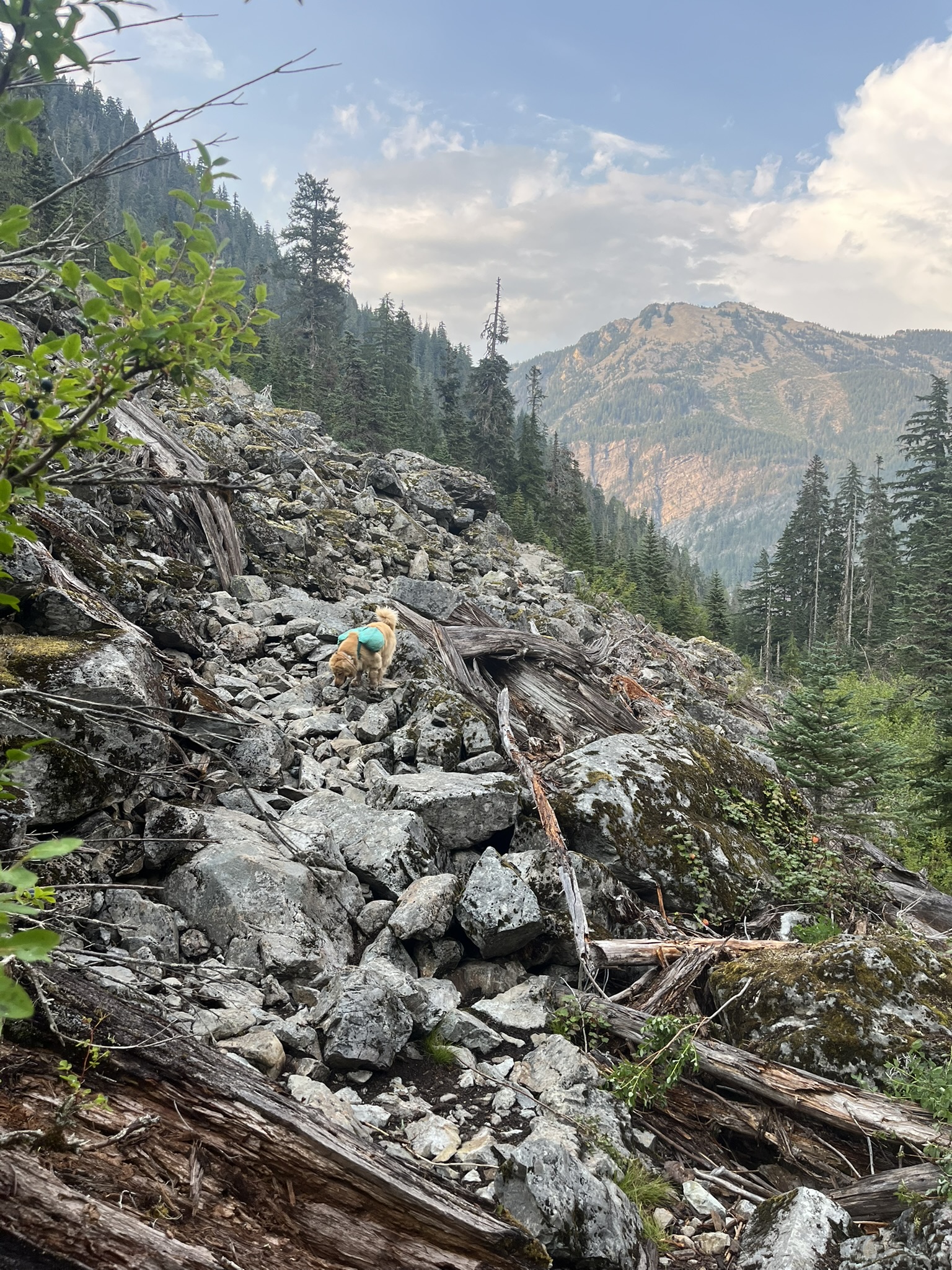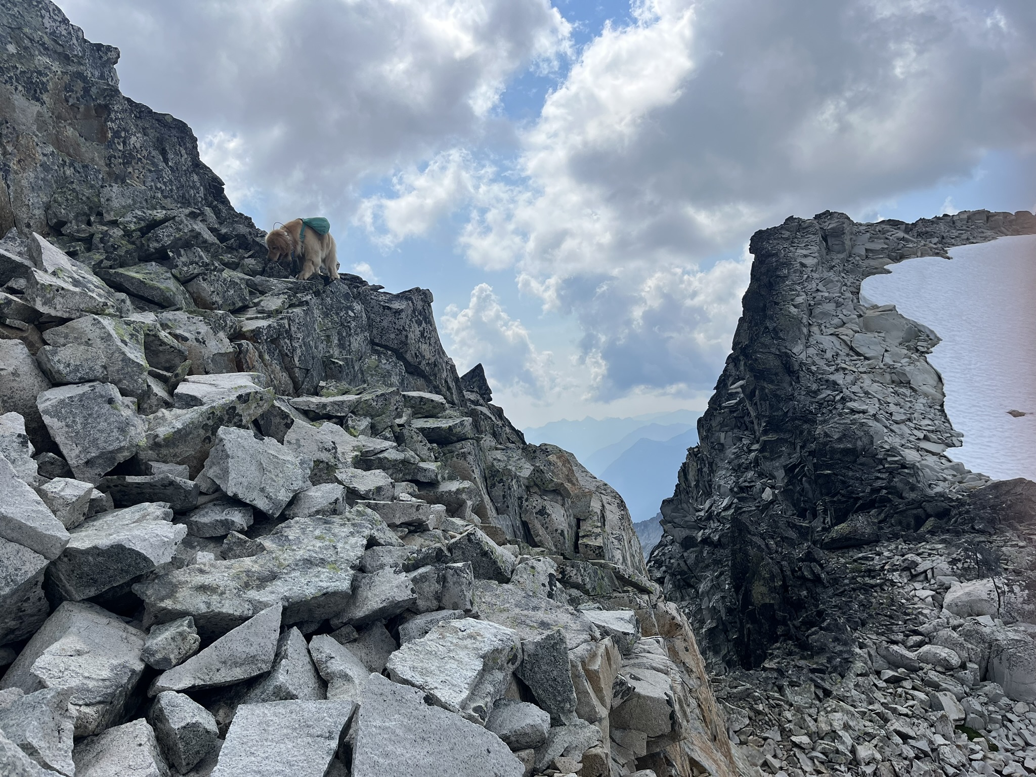 The descent off the high point dropped through a notch in the ridge. I scrambled over angular blocks between two rock spires, my pack bobbing, totally at home. This is terrain that would give most dogs pause. I am not most dogs.