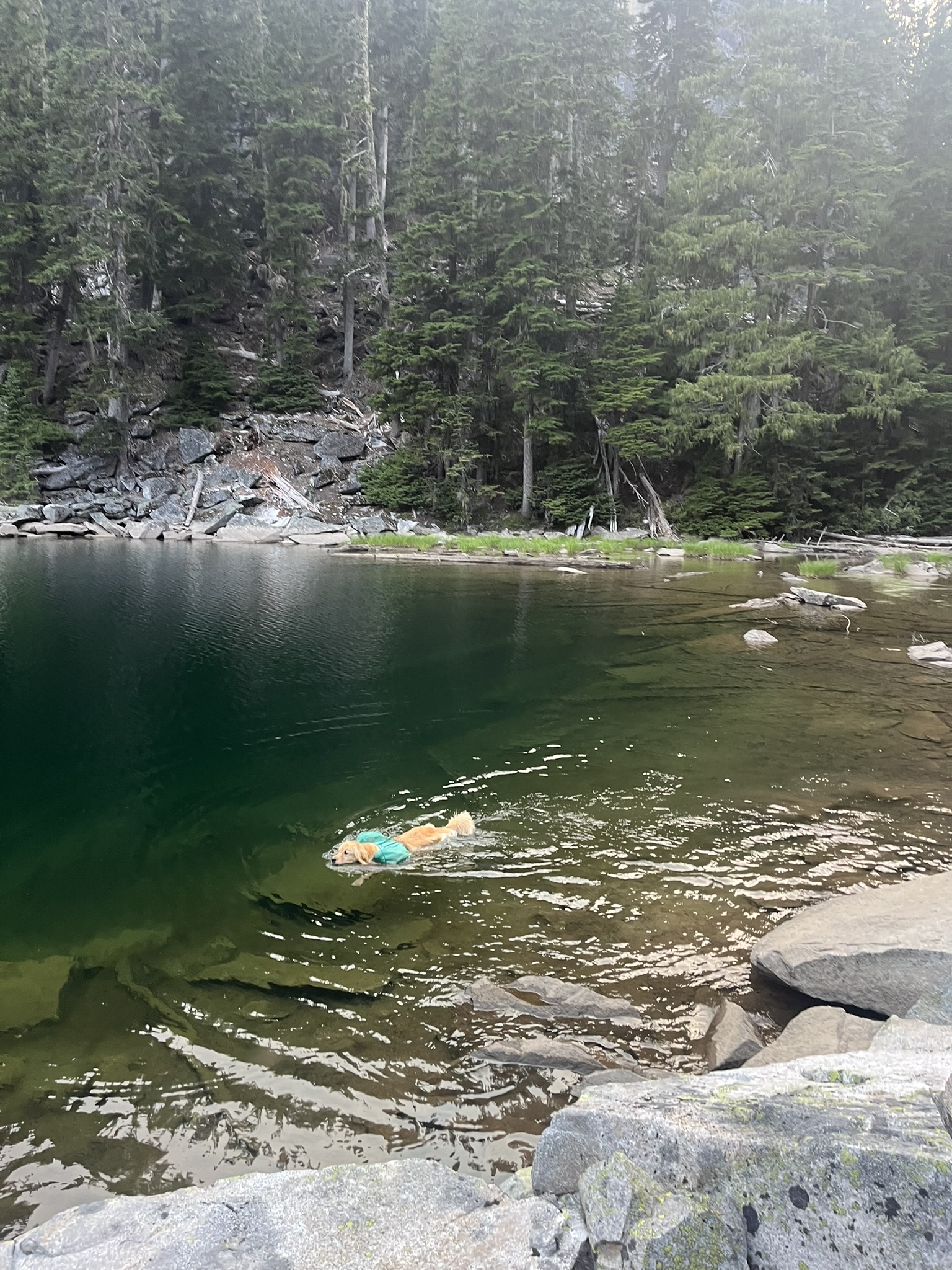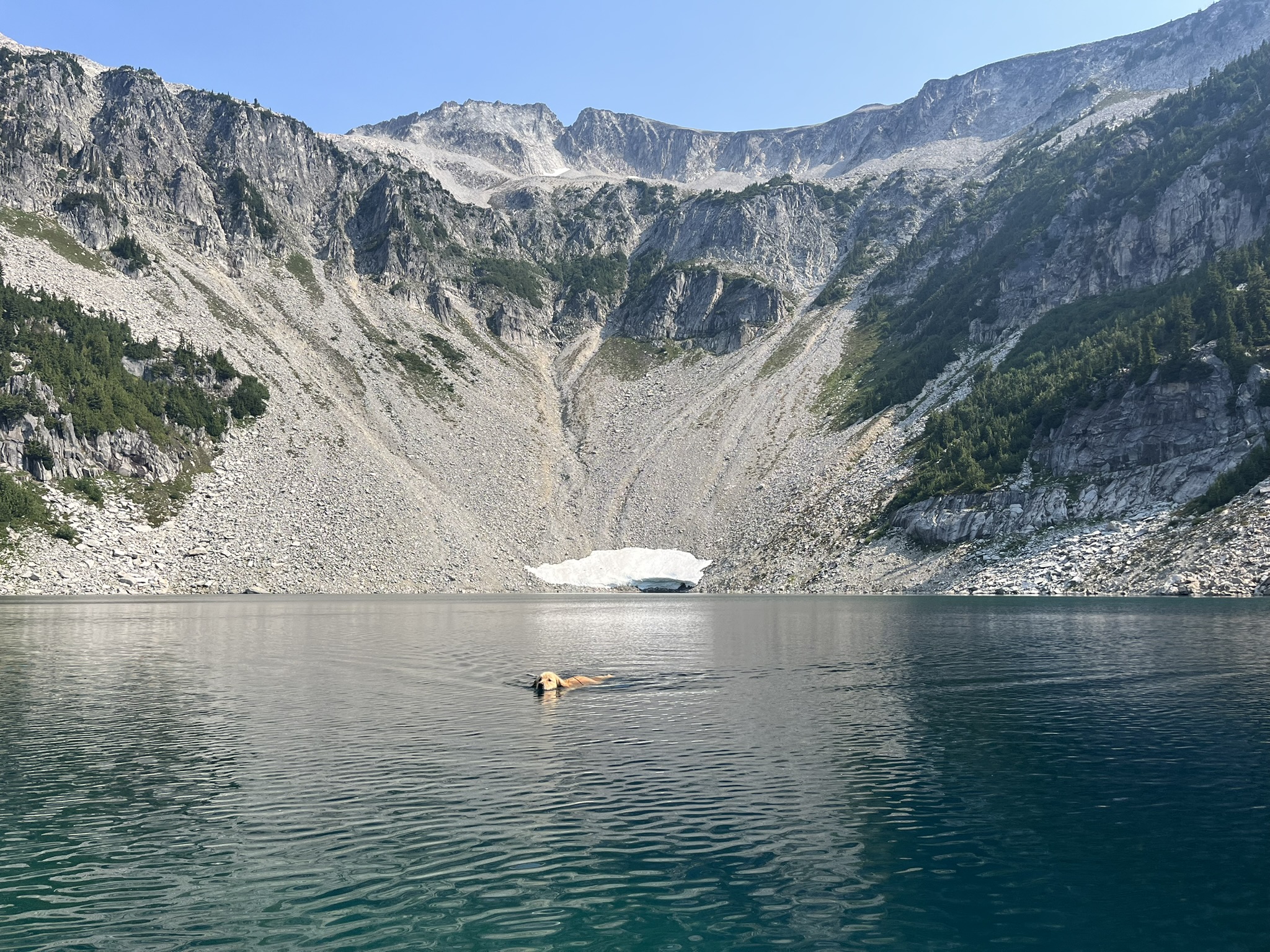 Then I was swimming. Out past the shallows into the deep turquoise, my golden head the only warm color in a world of gray and blue. The cirque wall rose sheer behind me, a snowfield clinging to its base. The water was so cold it buzzed against my skin, and I didn't care. I never care. Cold water is good water.
