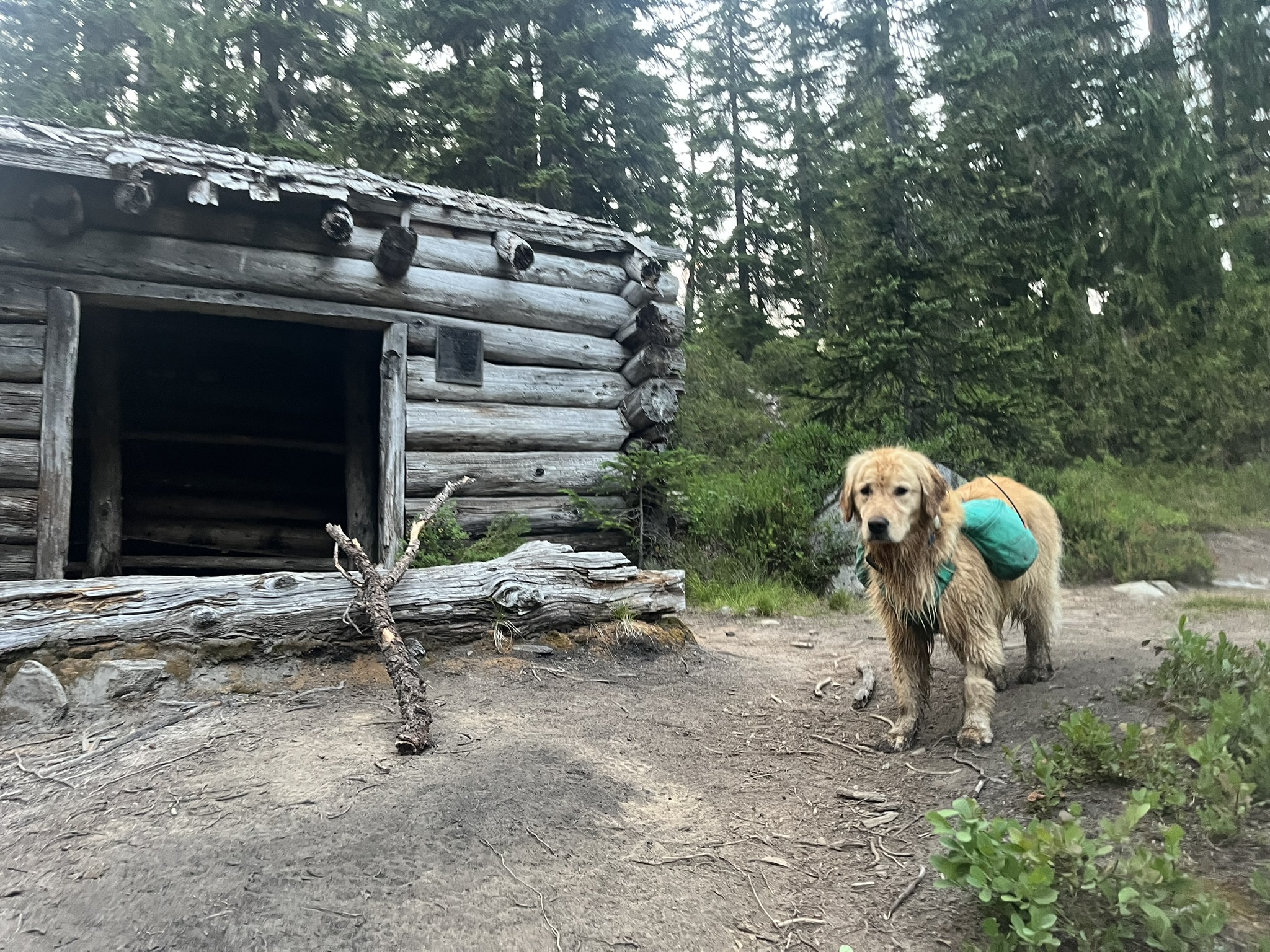 Near the lake we found the old La Bohn cabin — a weathered log shelter that smelled like decades of wood rot and mouse nests and rain. It's been standing in these woods long enough to look like it grew here. I stood in the clearing out front, soaked and ready for whatever came next.
