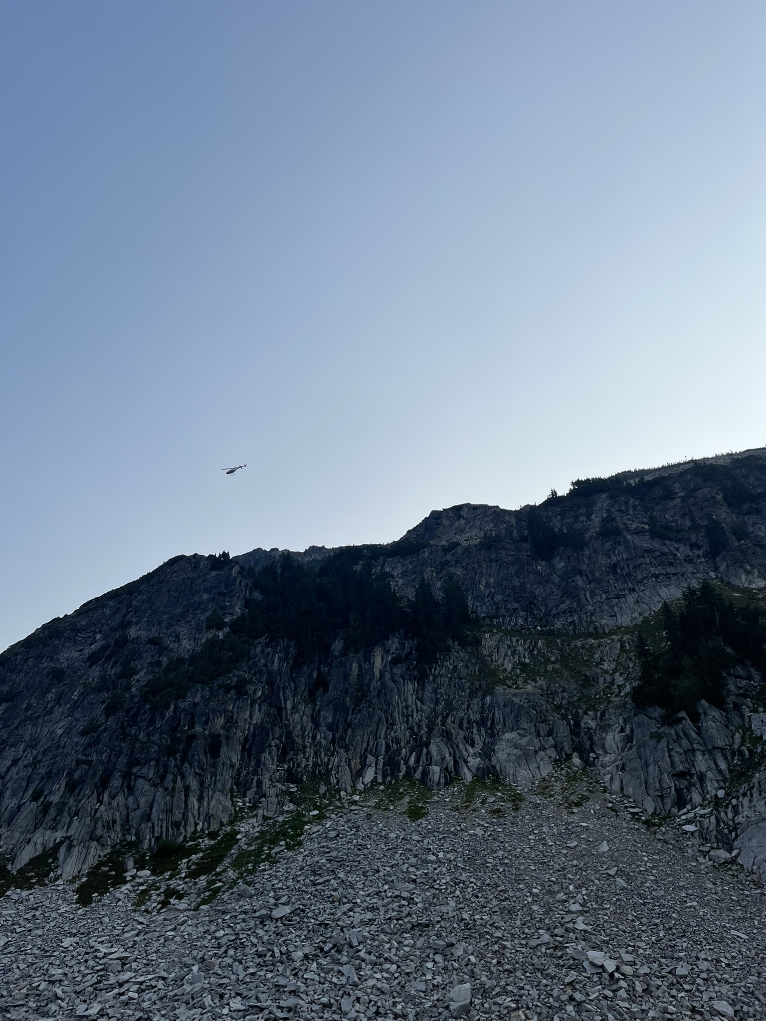 By morning, the lightning had started fires. Thin columns of smoke rose from the ridges to the south and west, and I could smell them — sharp and acrid, different from campfire smoke, more chemical. A helicopter appeared above the cliffs, circling low, its rotors thumping off the granite walls. It banked behind a ridge, came back, banked again. I watched it with my ears pricked. Loud, but not a threat.