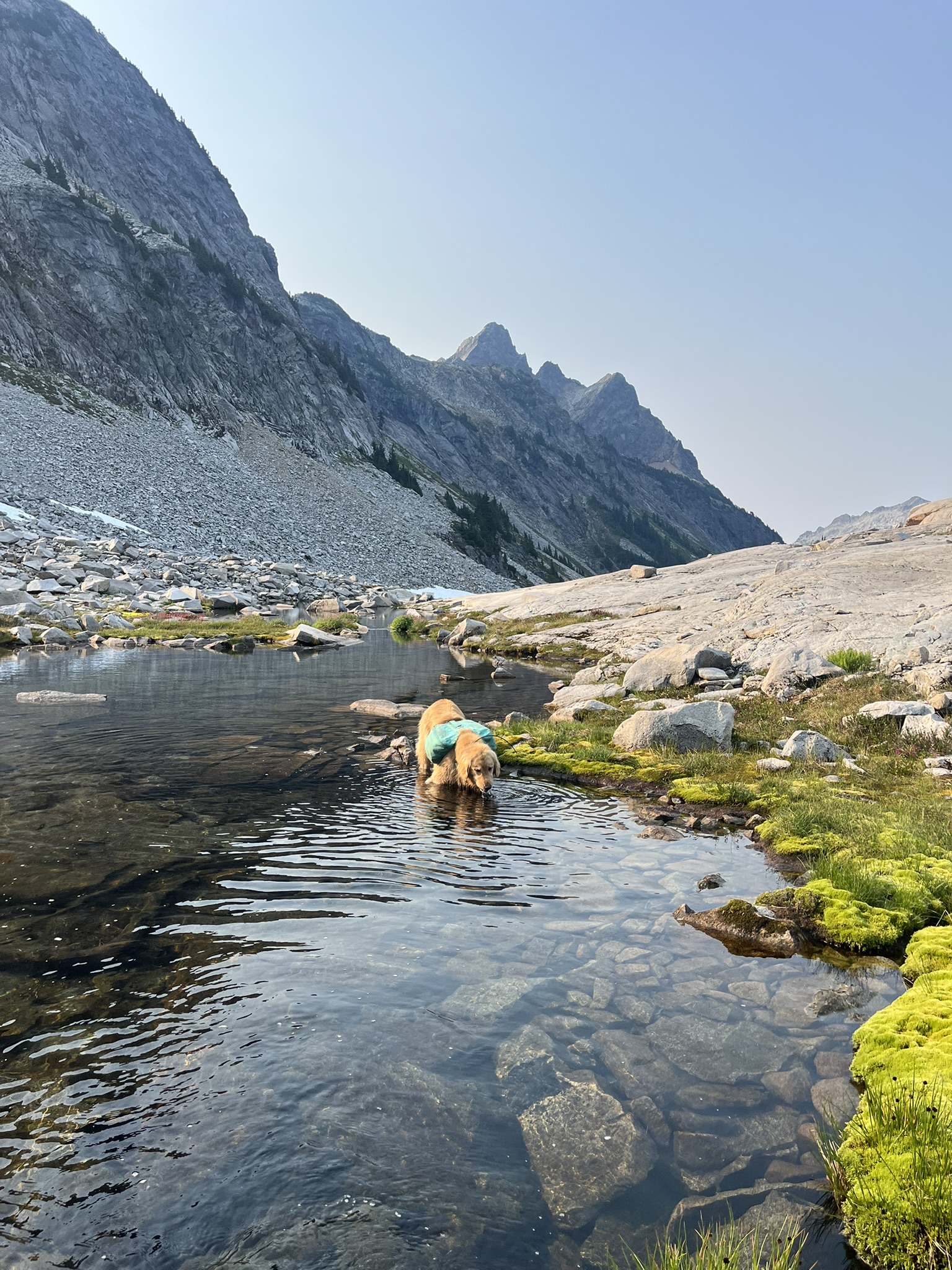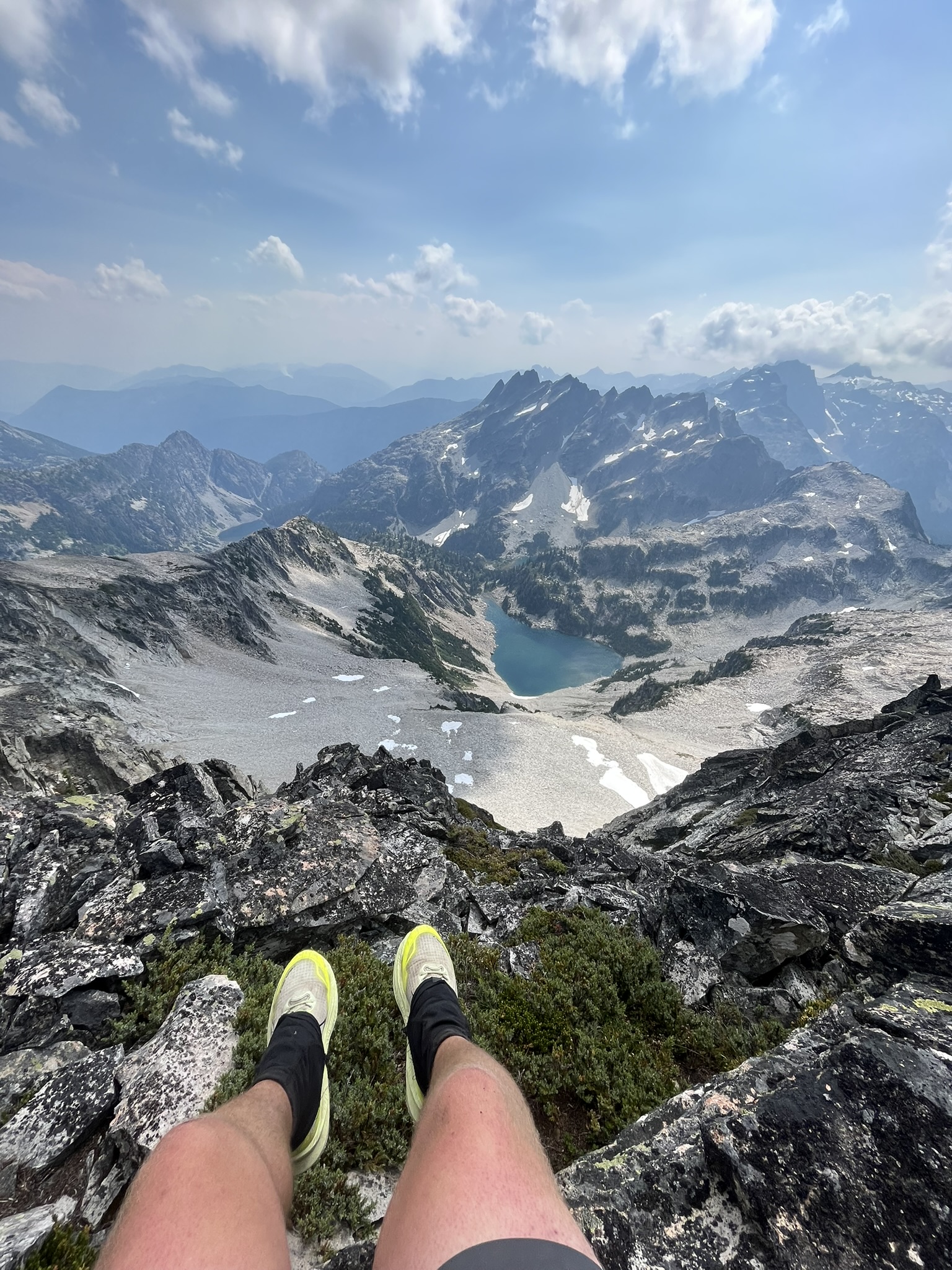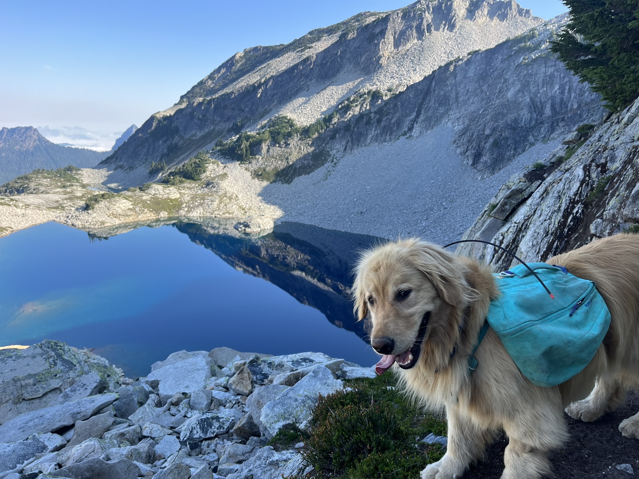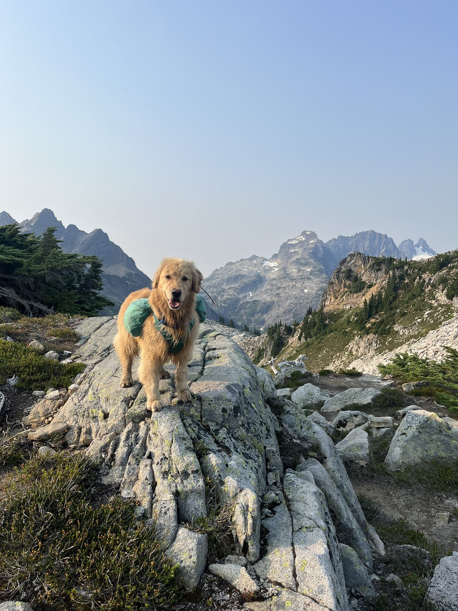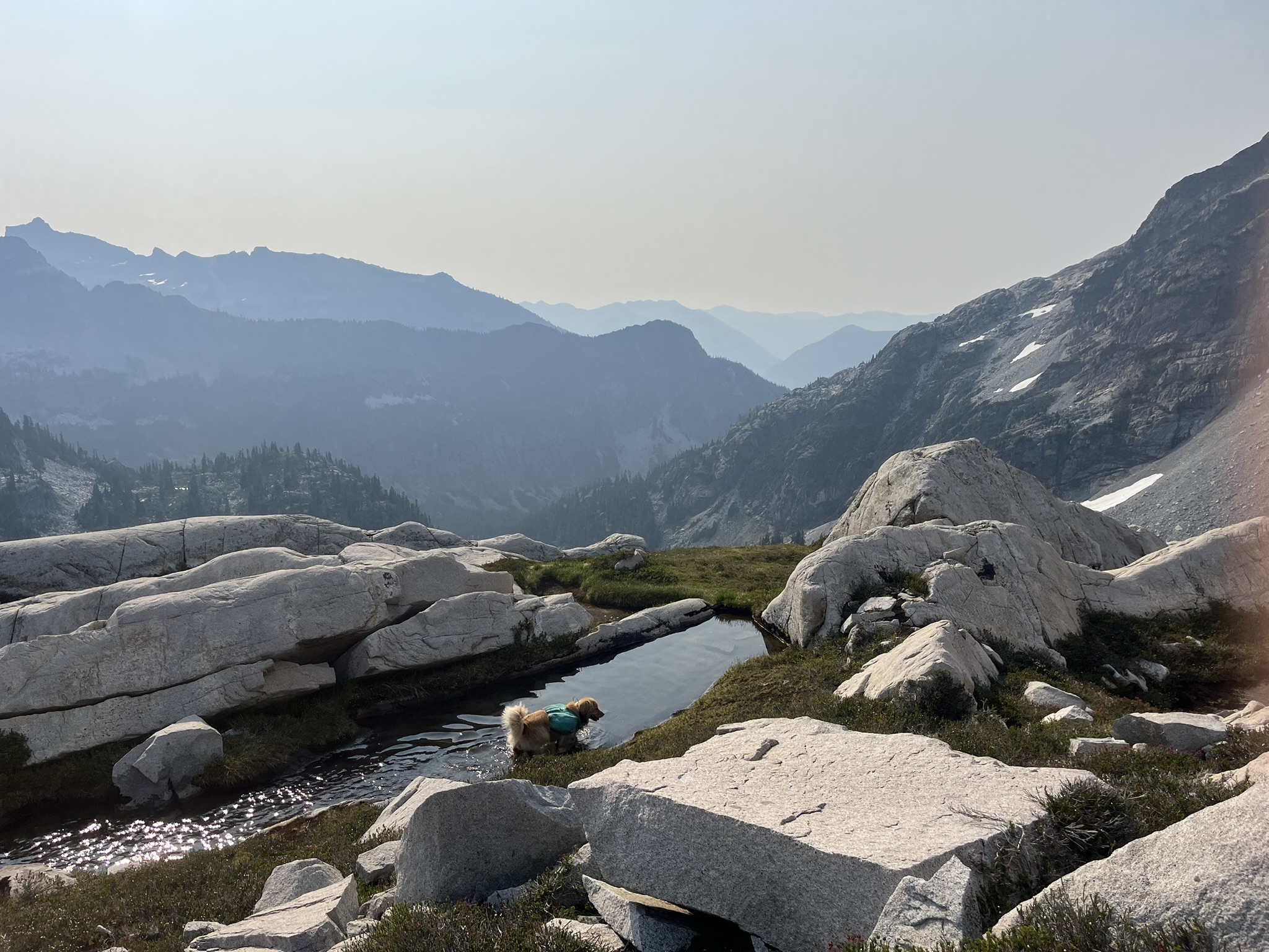 The high point came at 7,480 feet — a rocky perch on Hinman's upper ridge with views in every direction. Lakes below, peaks on the horizon, snow and granite in between. My human sat down and let his legs hang over the edge. I was somewhere behind him in the rocks, sniffing the wind, cataloging everything it carried. The Cascades stretched out smoky and blue and endless.