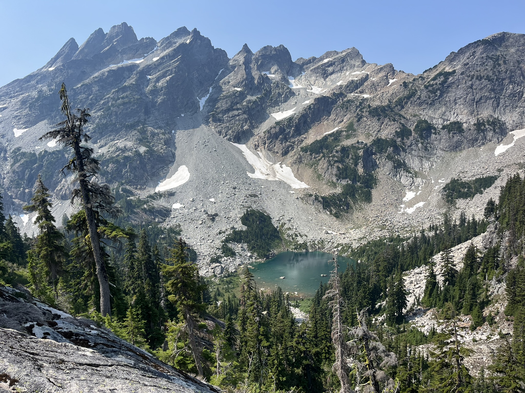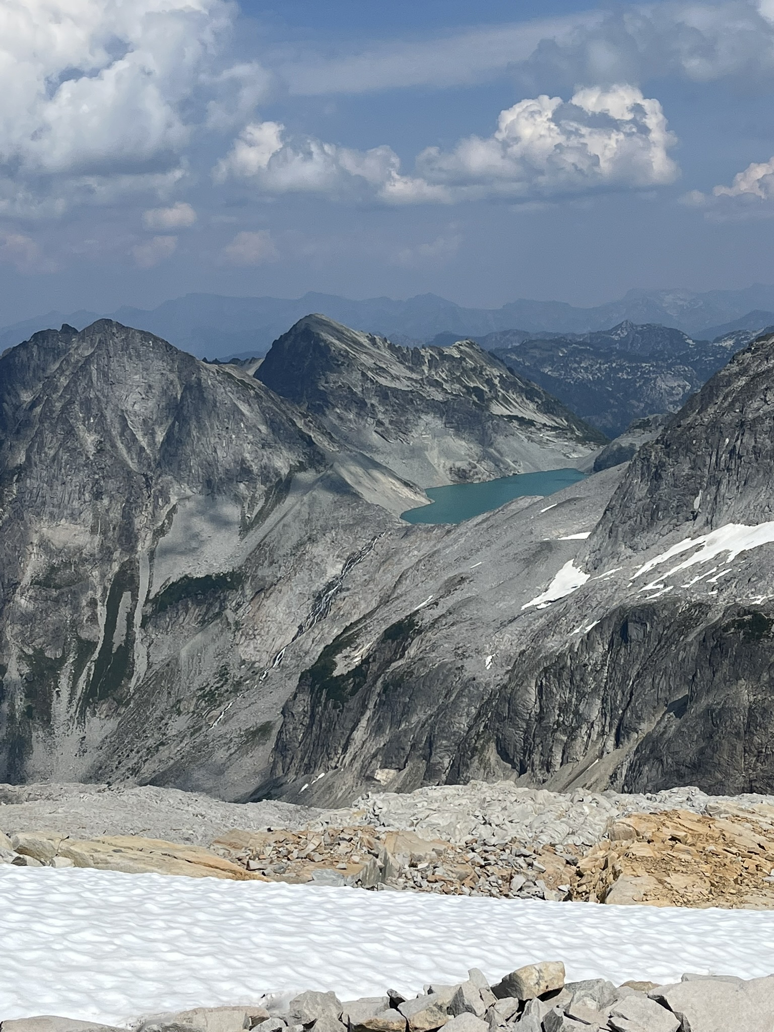 From the ridgeline above, the full scope of the basin came into view — a deep green lake in a perfect cirque, jagged peaks ringing the horizon, snow clinging to north-facing gullies. No trails. No signs. No one else for miles. This is the part of the mountains I like best. The part where the trails end and the real terrain begins.