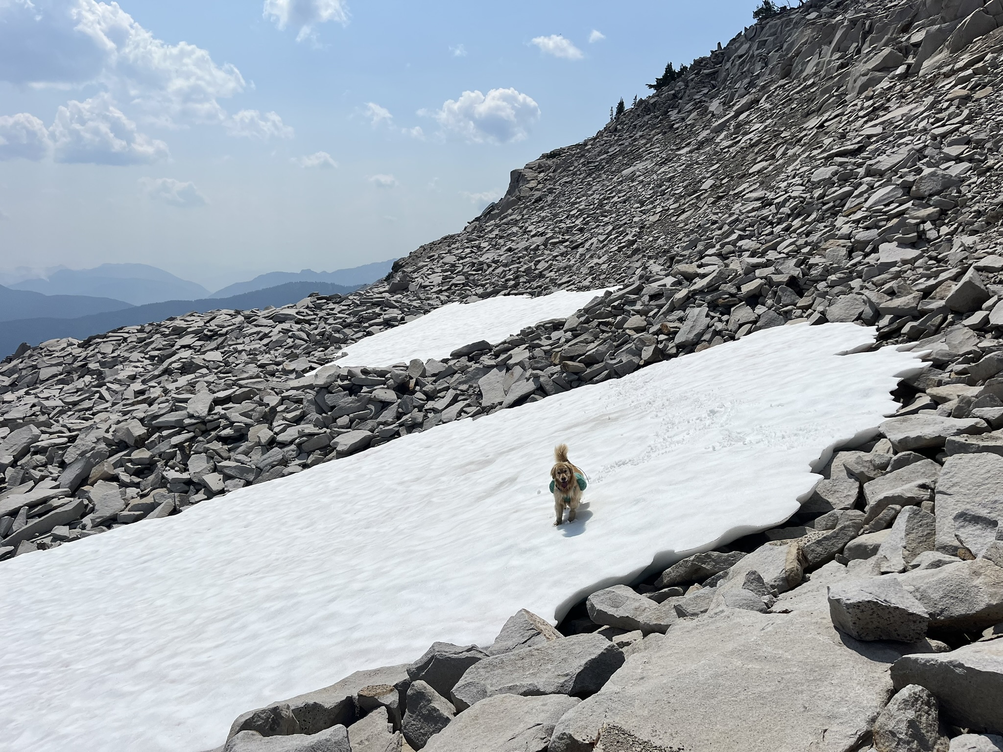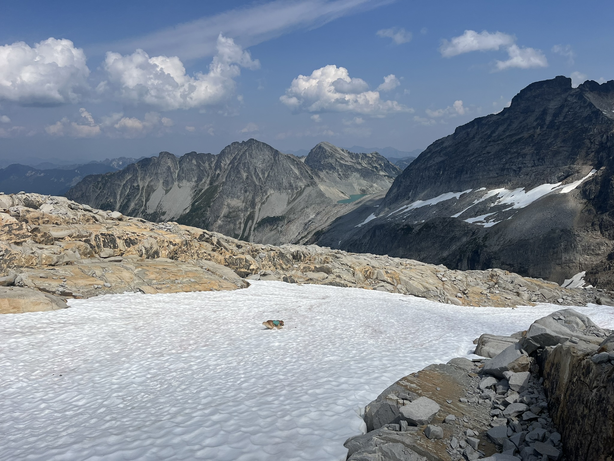 The route climbed northeast from Lake Rowena up Hinman's southeast shoulder — extremely loose talus, the kind where every step sends something sliding and every scramble requires four-point contact. My four points are better than my human's four points. We climbed. To the south, the Pea Soup Lakes sat in their basin, and beyond them the ridgelines stretched out hazy and familiar. I crossed a snowfield at 6,400 feet — a small golden shape on a white slope with the whole Central Cascades behind me. The snow was suncupped and firm, good traction for claws.