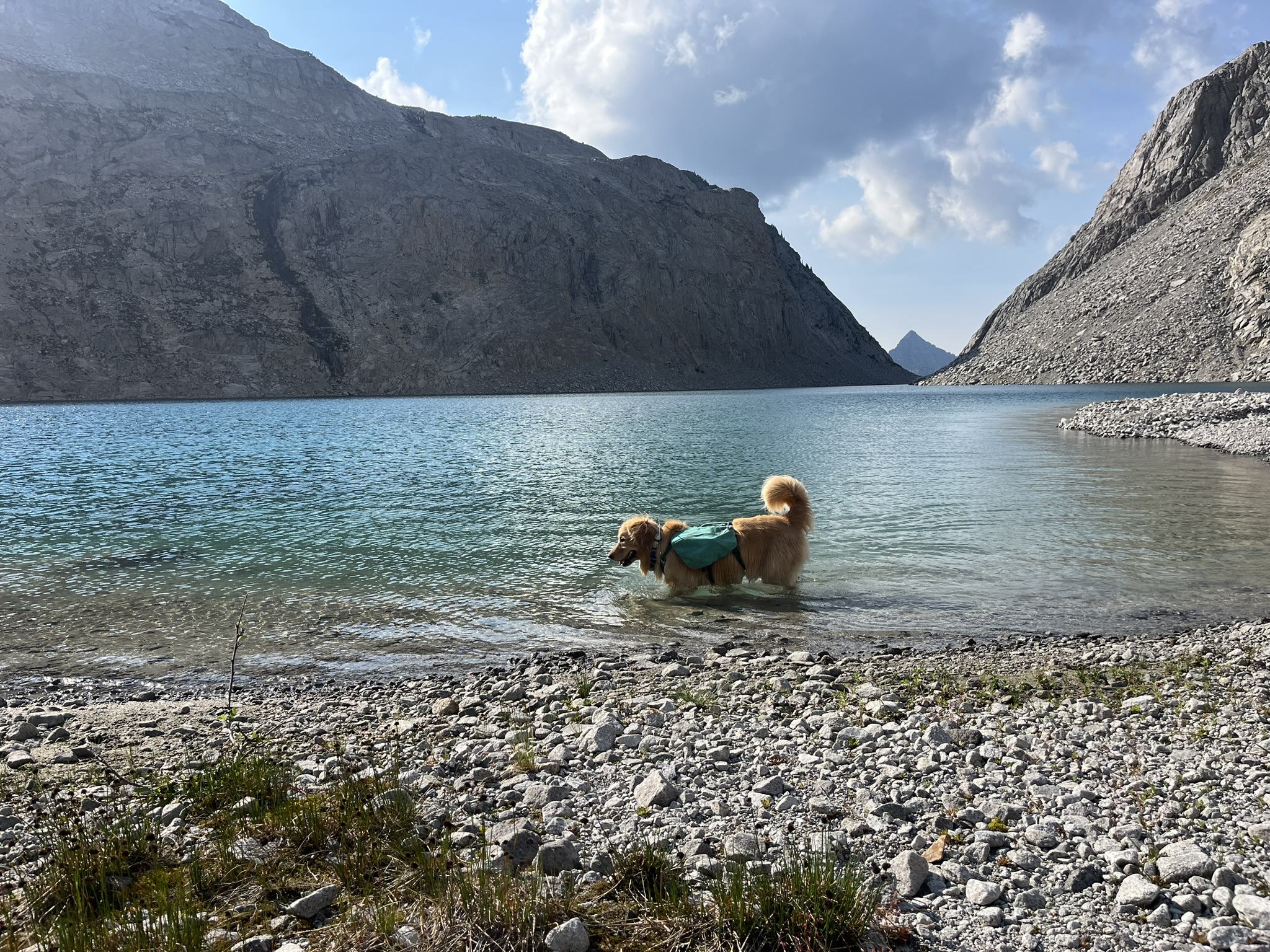 The terrain on Hinman's south side dropped into the Lake Rowena basin — turquoise lakes, deep and cold enough to make your teeth hurt. My human says the color comes from glacial flour in the meltwater. I say the color comes from the lake being perfect. In the August sun they looked almost tropical, completely wrong for a granite cirque with cliffs rising a thousand feet above. I loved it.