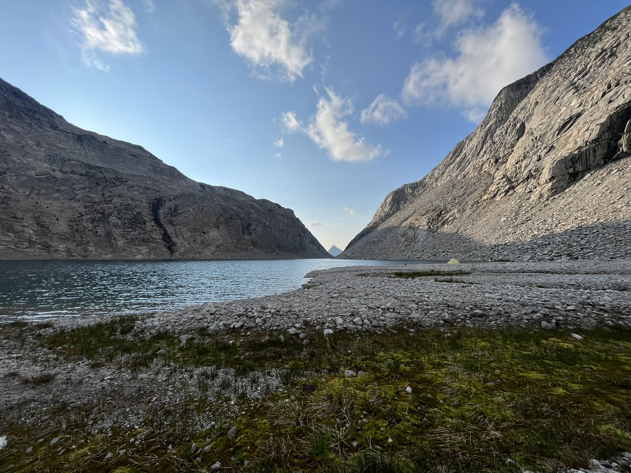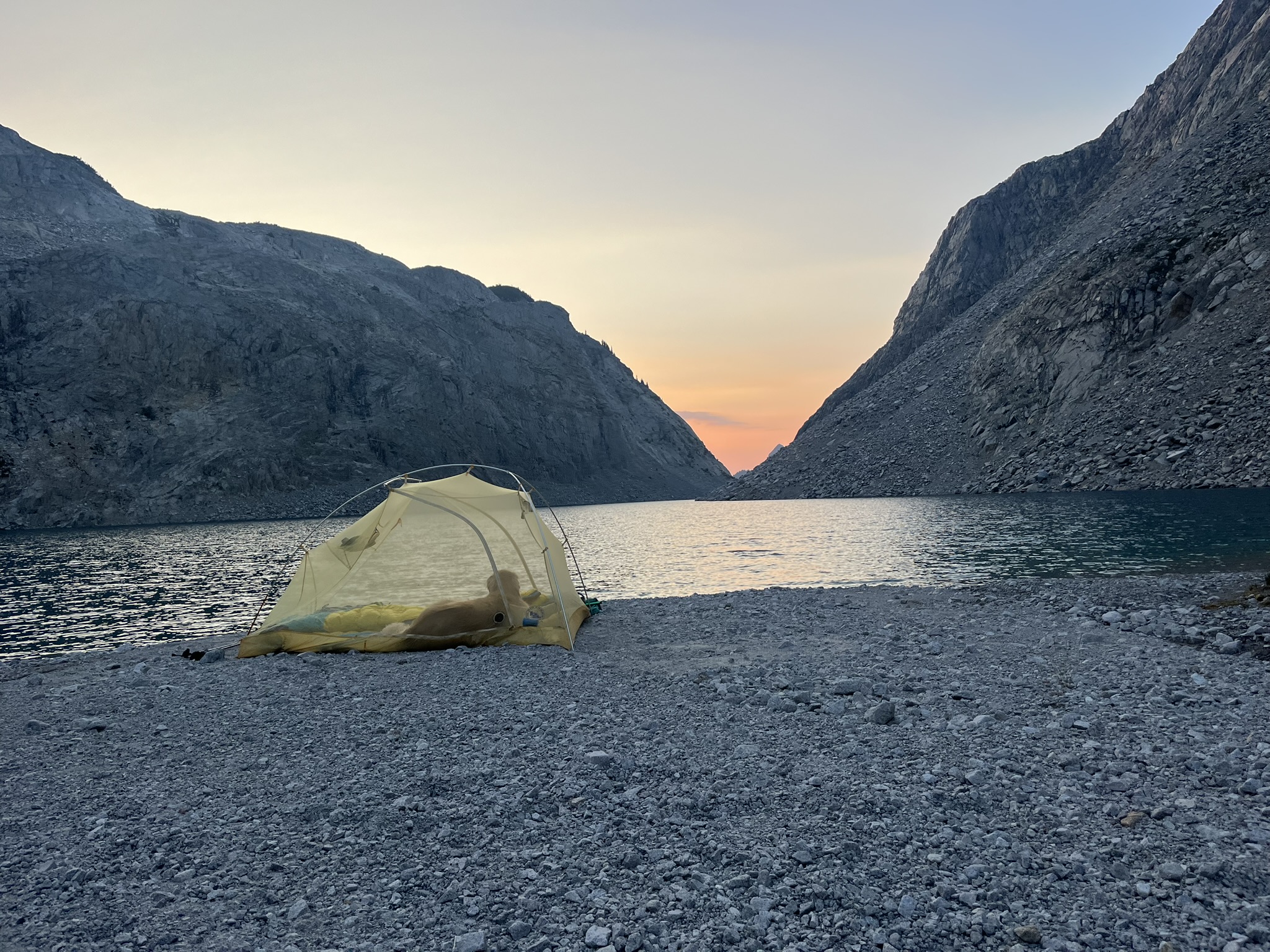 We set up the tent on the gravel shore and watched the sun set through the gap in the valley walls. The light went from white to gold to pink, and the lake turned from turquoise to silver. I lay in the tent doorway and watched it with my human. The gravel was cold under my belly. The air smelled like snow and stone and the very end of a day.