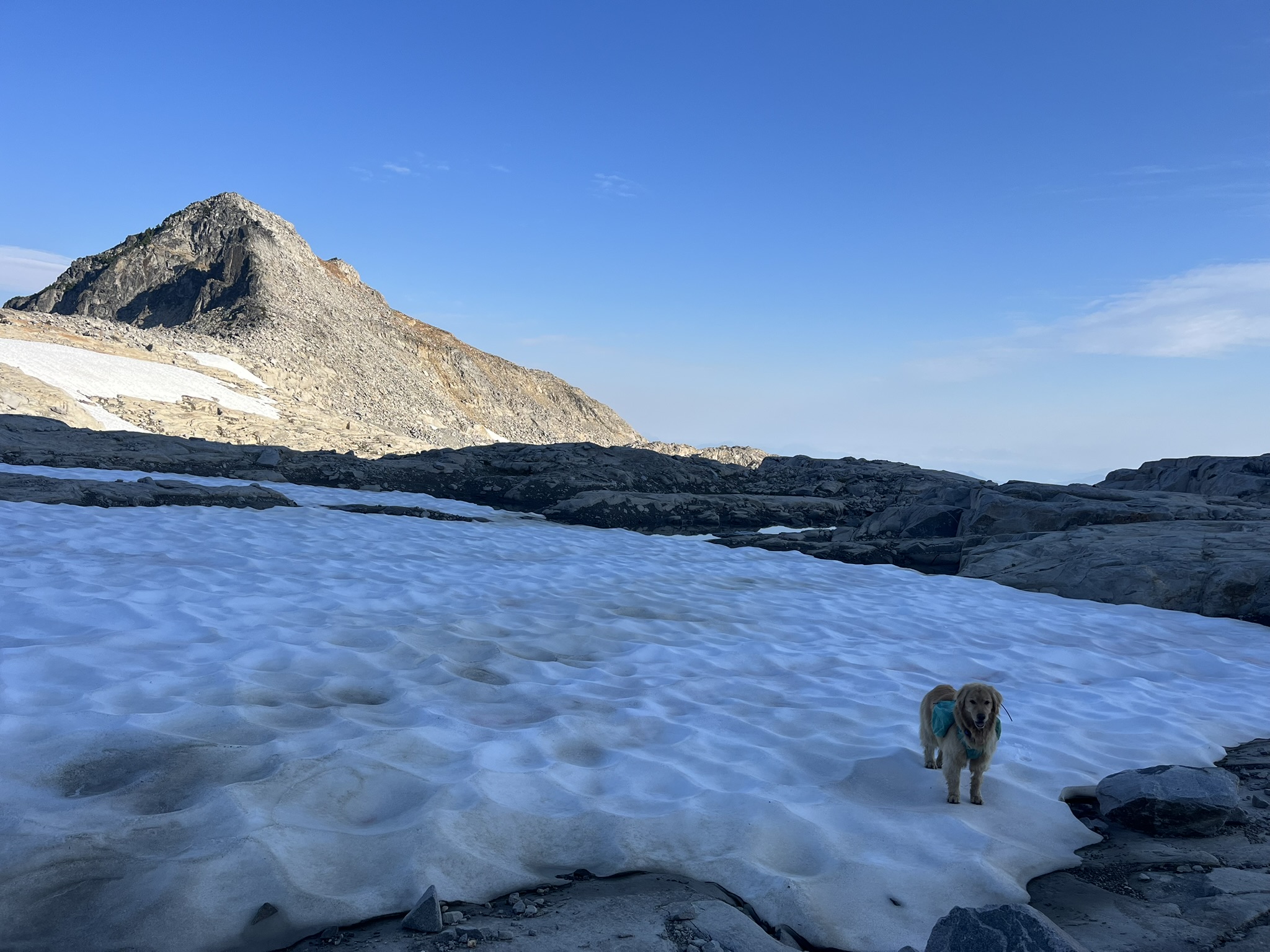 The west side of Hinman was different from the east — broader snowfields, bigger glacial features, a feeling of openness that the cramped cirques on the other side didn't have. I crossed a suncupped snowfield with the summit pyramid rising behind me. Golden fur against white snow against blue sky. Three days into the trip and I felt like I could keep going forever.