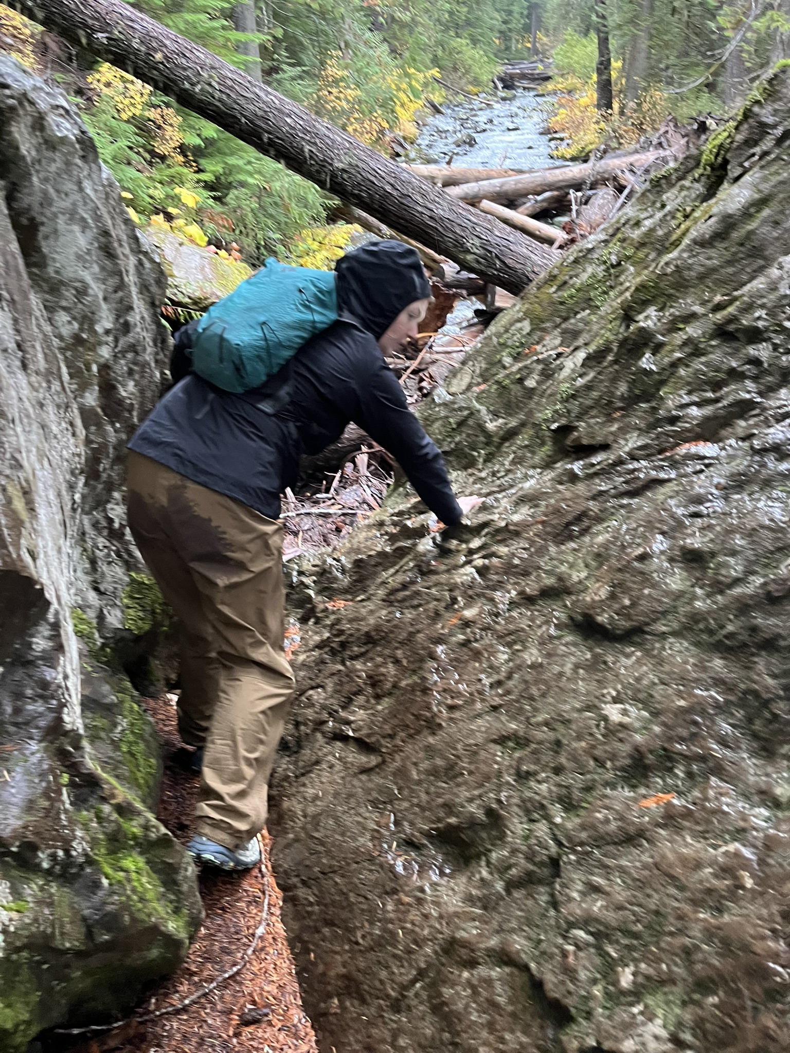 The creek crossings slowed us further. Cold water over slick rock, each one requiring a moment to pick a line. The forest was old and dense — western hemlock, Douglas fir, the understory choked with sword fern and devil's club. Every surface was wet. I didn't mind. I smelled things in the damp that dry air never carries — fungal networks under the duff, a vole somewhere close, the mineral bite of exposed rock.