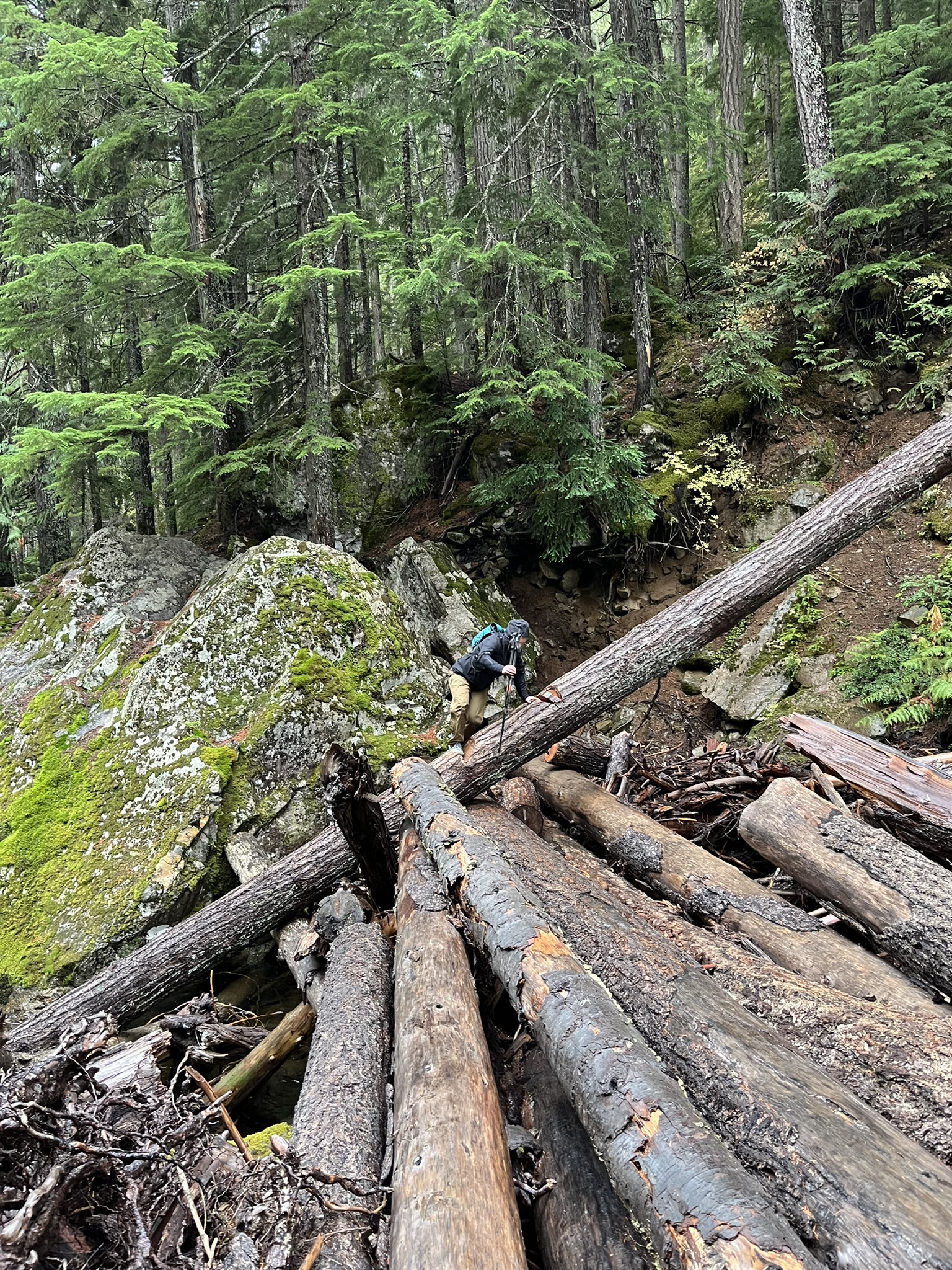 Within the first mile, the terrain went from walk to war. Any trace of a use trail vanished into a wall of fallen timber — massive logs stacked and crisscrossed, bark stripped by weather, moss growing thick on everything. This wasn't step-over blowdown. This was hands-and-knees, straddling logs, ducking under root wads, squeezing through gaps barely wide enough for a loaded human. Barely wide enough for a golden retriever, too, but I'm more flexible than I look.
