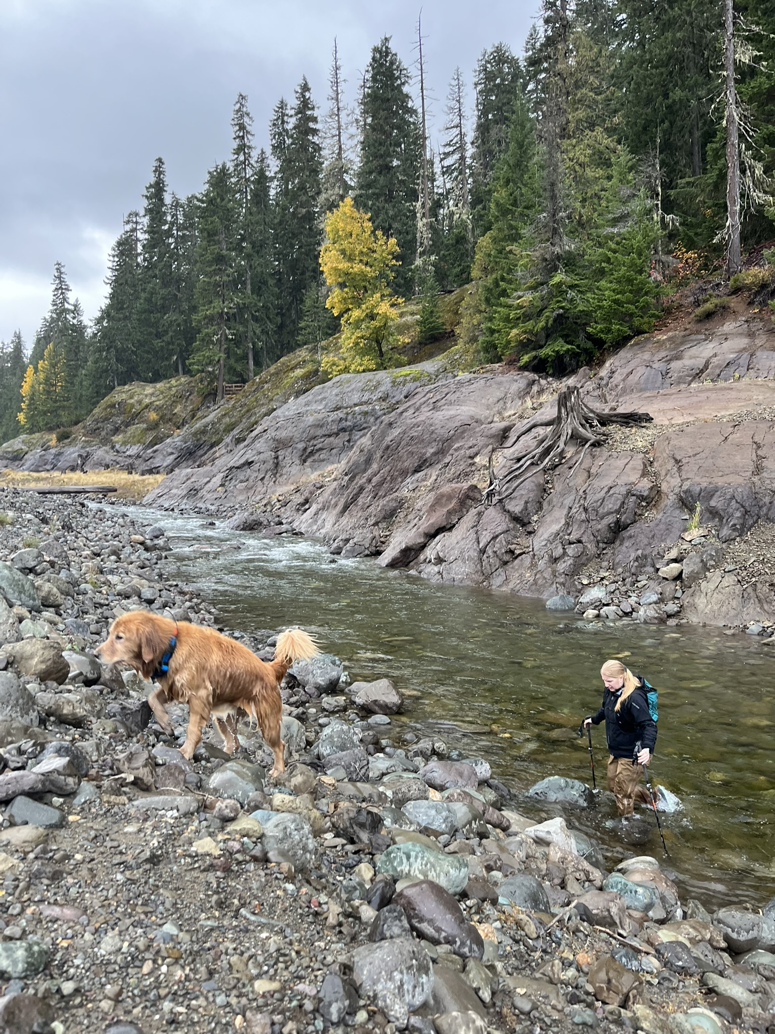 This is why we came. Not the miles, not the bushwhack, not the rain. This — standing in a mountain lake in October, cold water pressing against my ribs, watching the clouds move across the ridgeline above. The world was quiet except for the wind on the water and a raven somewhere high on the ridge. I breathed it all in — the cold, the green smell of the deep lake, the cedars on shore. My human stood on the rocks and took a photo. I didn't pose. I just stood in the water being exactly where I wanted to be. He knows the difference.