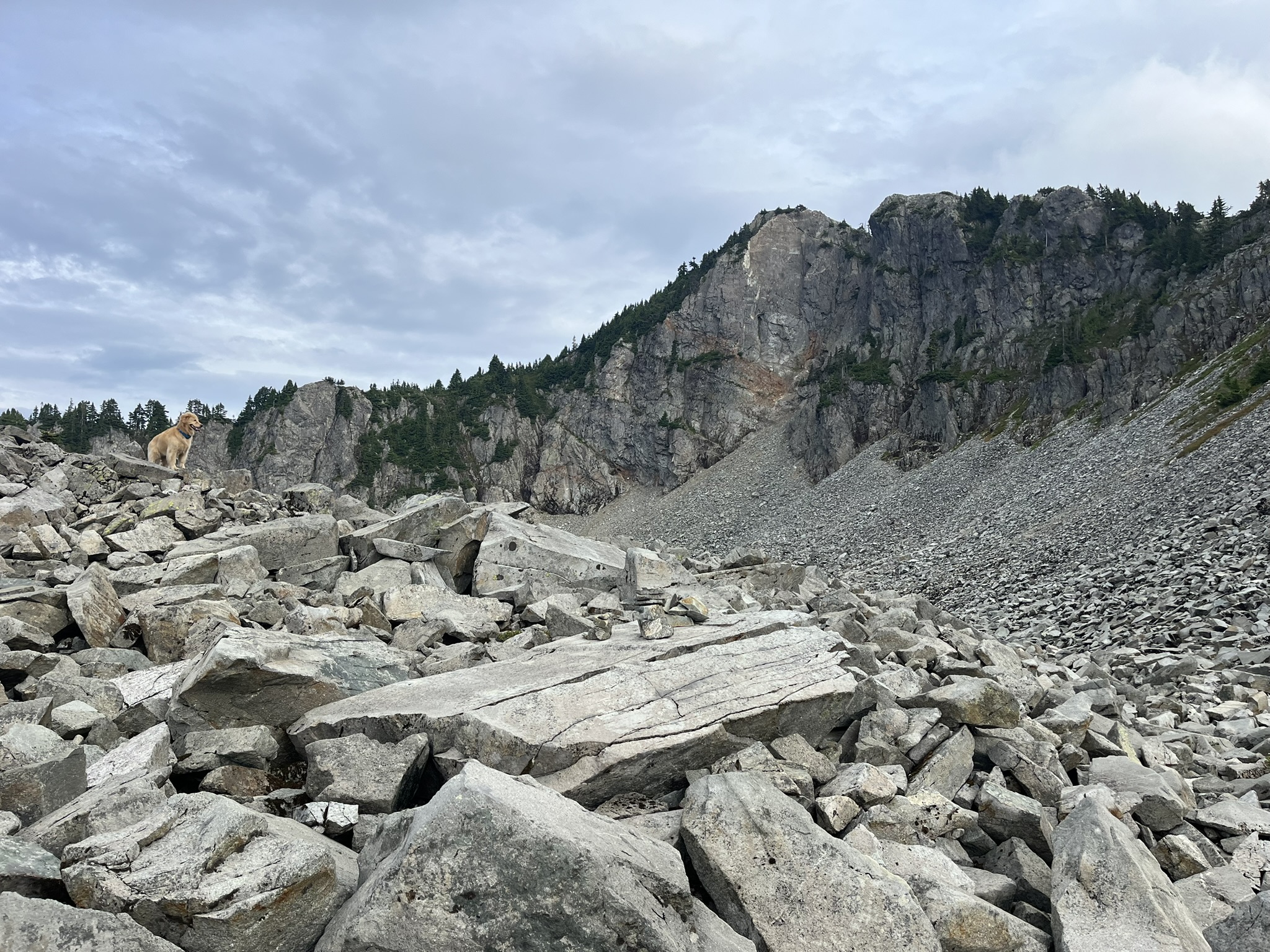 We dropped via a different route to make it a loop, descending through a massive talus field. I picked my way through the boulders, cliff walls rising behind me, each rock wobbling slightly different than the last. You learn how to read talus. This is a skill I have.