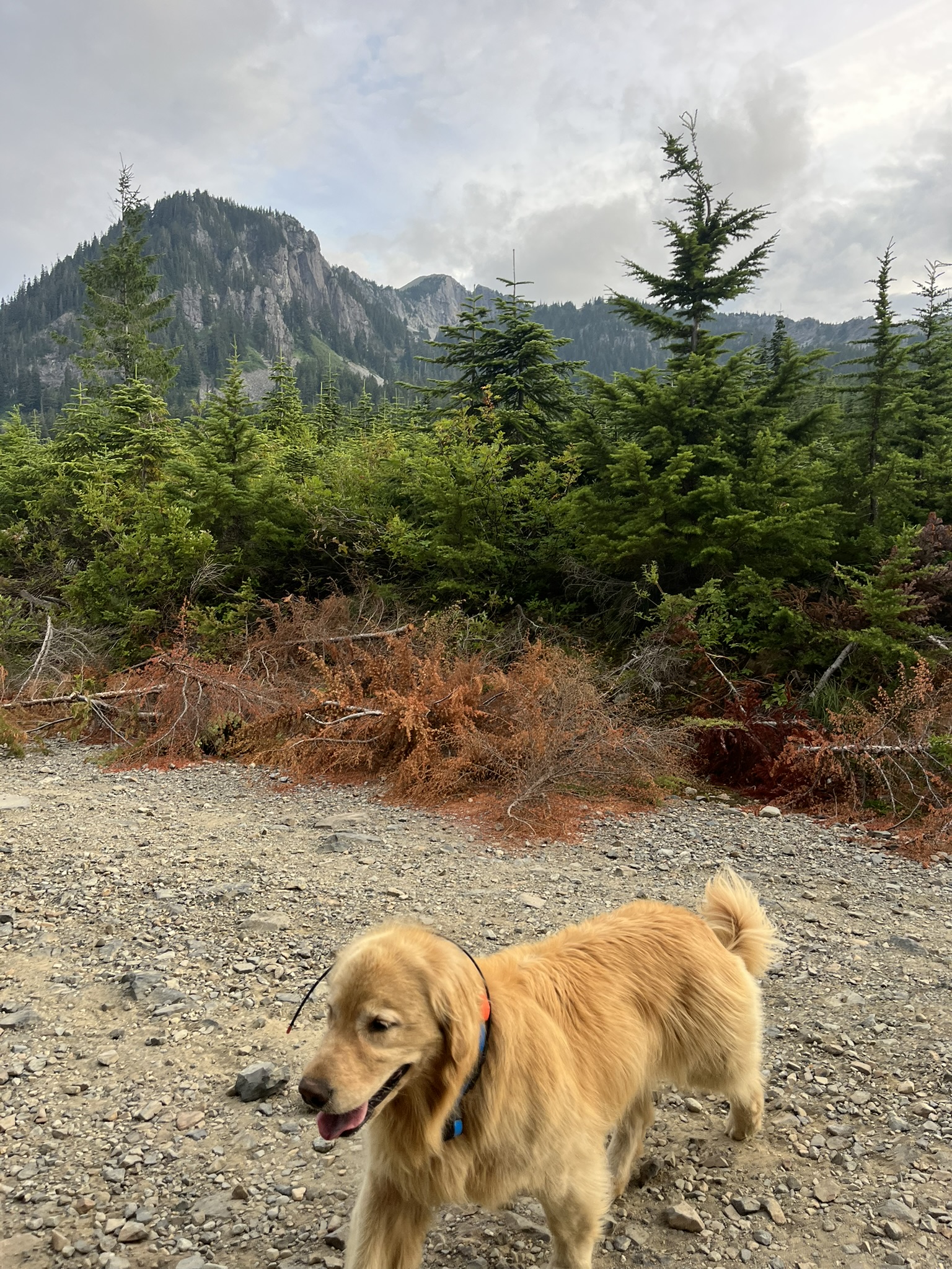 Tuesday evening, early August. My human came home from work and loaded the car. I knew from the speed of it — quick trip, close to home. Snoqualmie Pass. The clouds were dragging across the peaks, moody and gray, the kind of evening that smells like damp rock and impending weather.