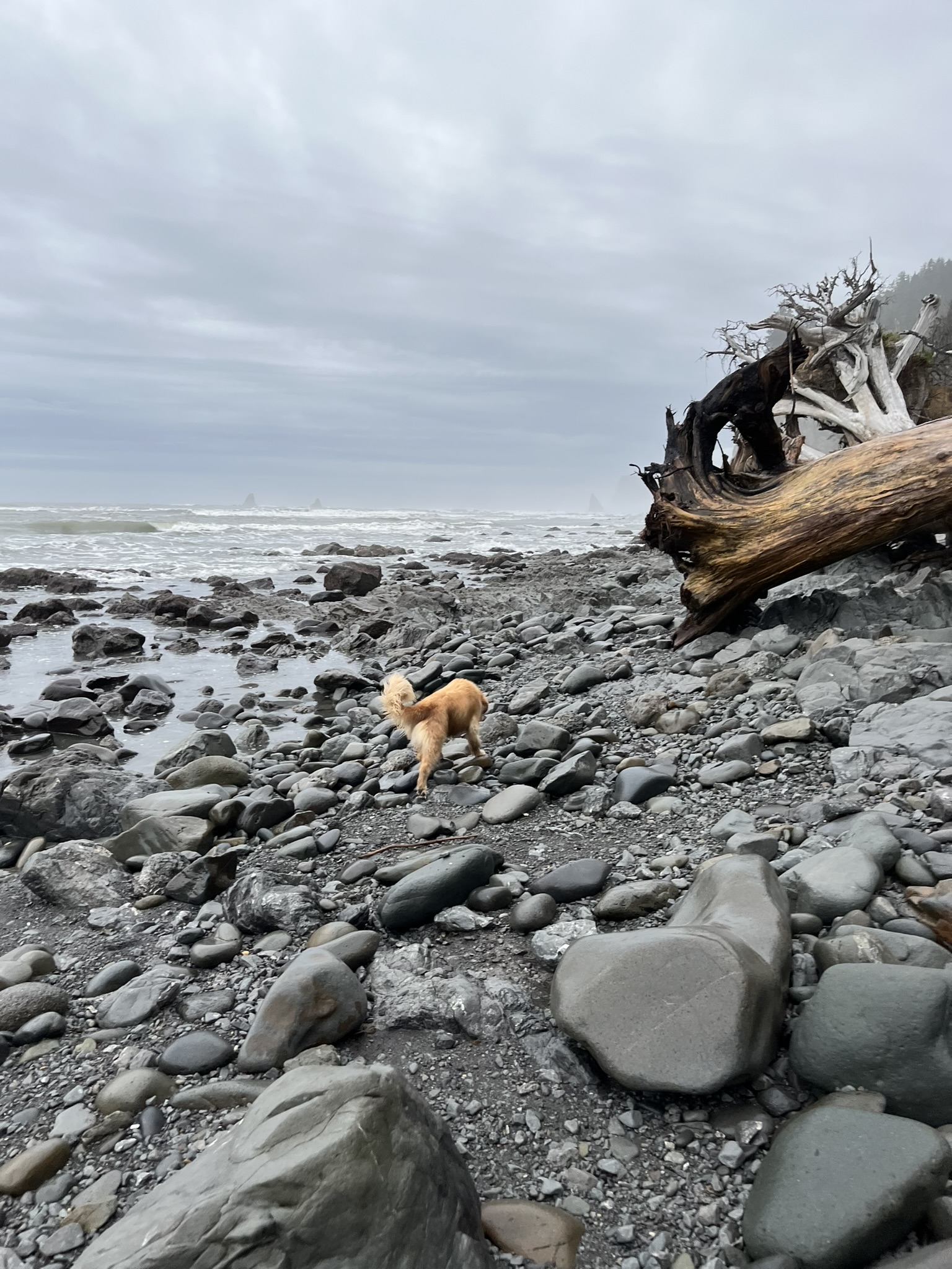 The first thing I noticed was the smell. Salt, kelp, wet stone, decaying crab, driftwood bleached to bone. Nothing like the mountains. The beach was all cobble and driftwood — I picked my way between smooth gray boulders and massive root wads, the Pacific rolling in flat and gray under heavy clouds. The ocean was louder than anything I'd ever walked next to.