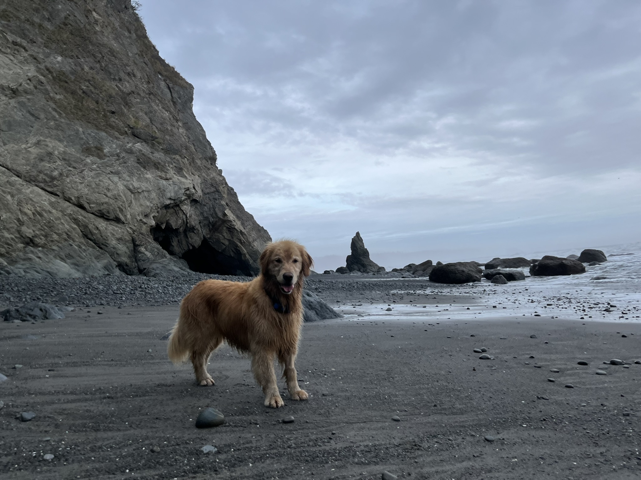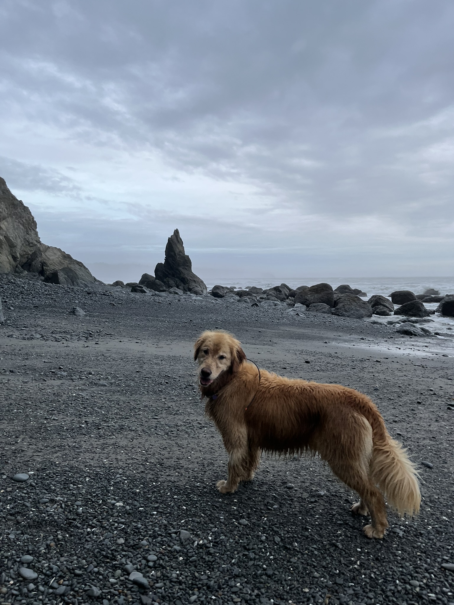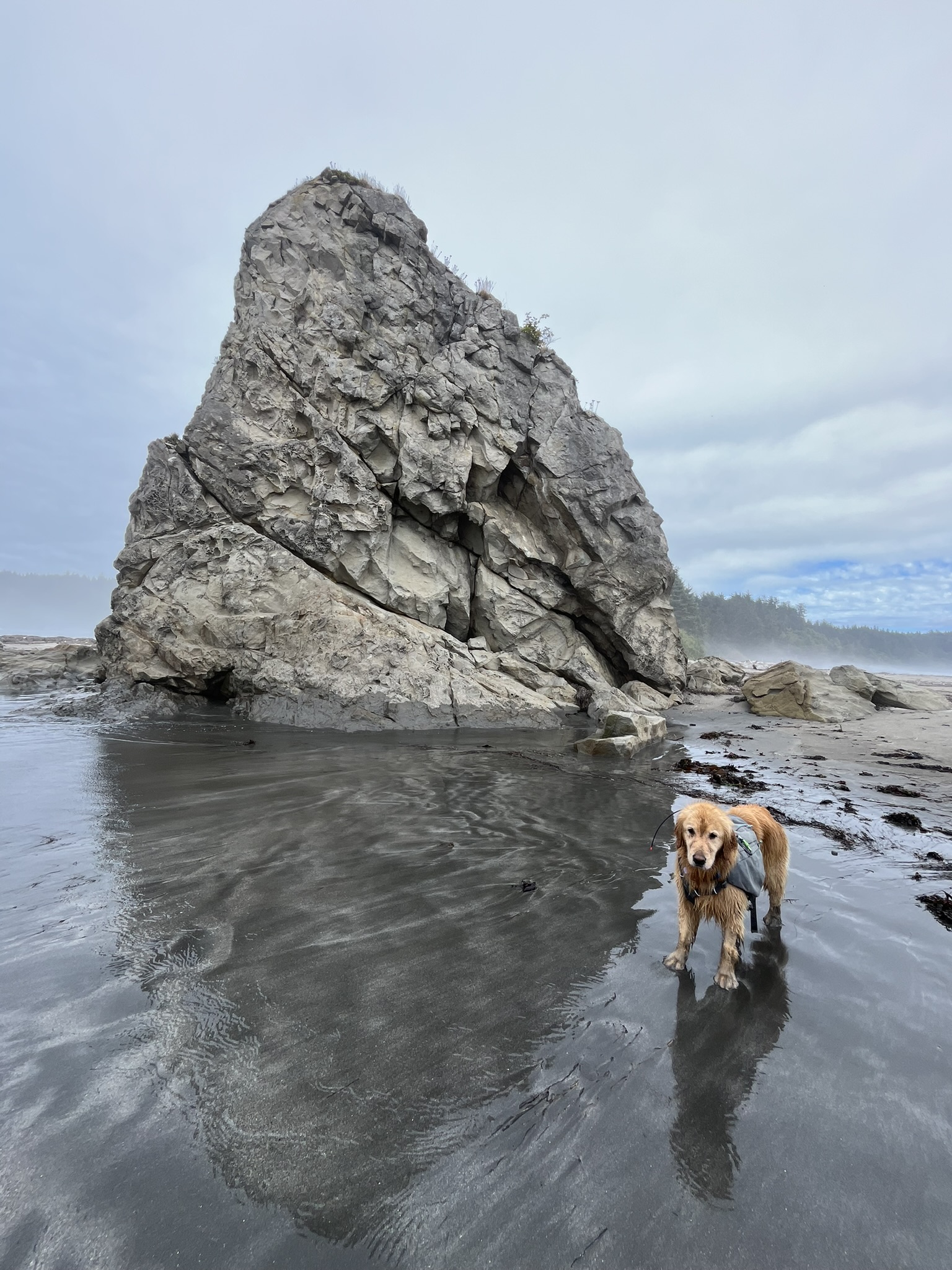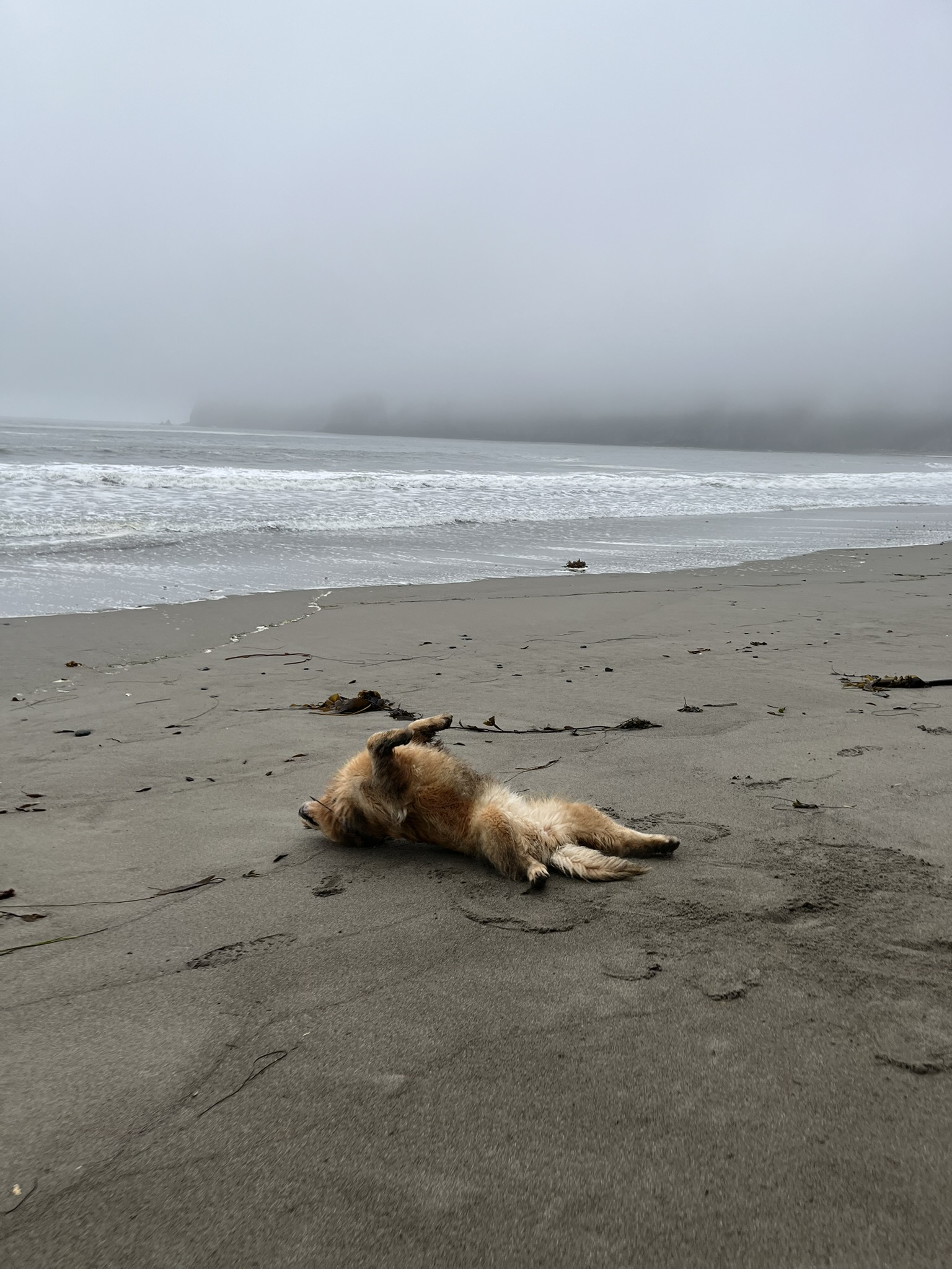 And then I was done. I dropped onto the sand, rolled onto my back, and lay there — paws in the air, fog overhead, waves breaking nearby. Twenty miles of Olympic coastline behind me. Salt in my fur. Sand in my ears. The best kind of finished.