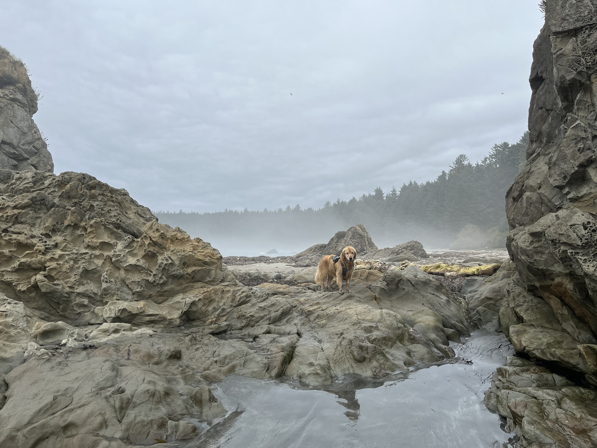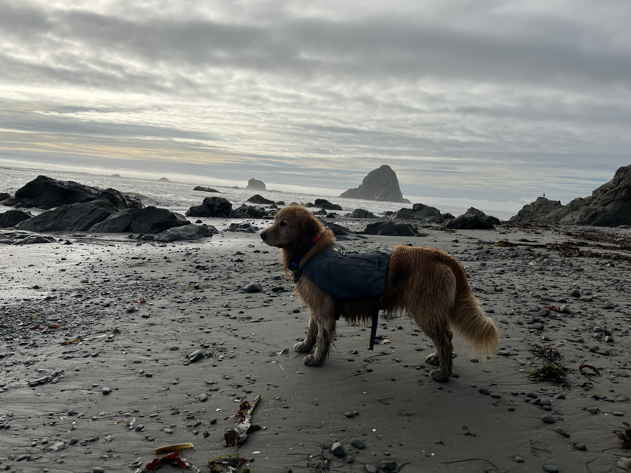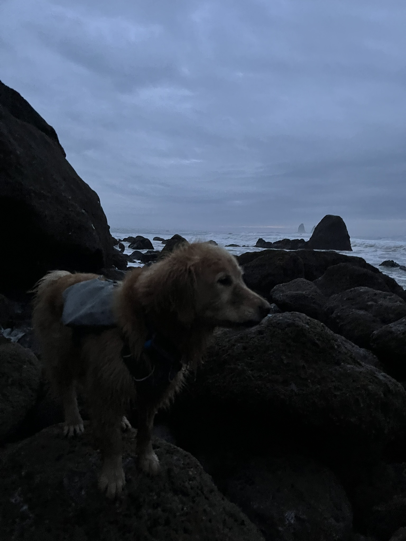 I scrambled over dark boulders in the fading light, soaked, wearing my pack. Sea stacks dissolved into mist behind me. The water was close. I could feel the spray on my belly fur. Not dangerous — but the ocean has a way of reminding you that it makes the rules here. Not us.