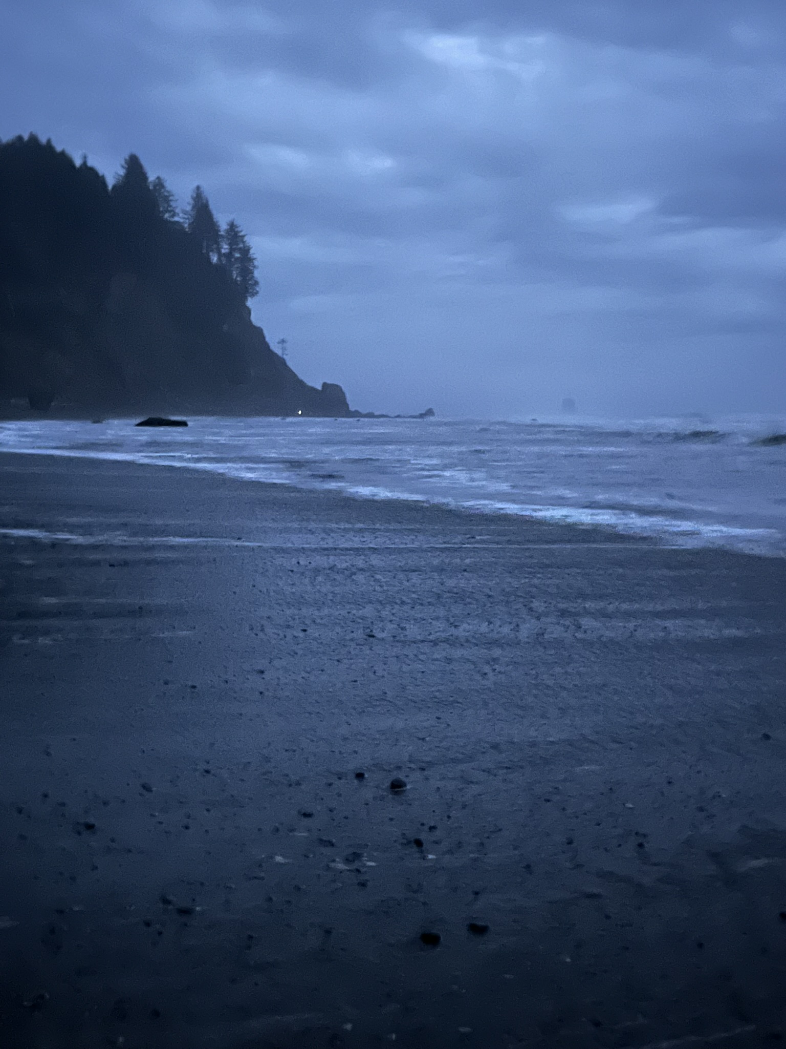 By 7:40 PM we were through. The tide had dropped to about 2.7 feet by the time we cleared the last headland. Ahead, a wide beach stretched into blue twilight — forested headlands rising above the surf line, sea stacks ghosting in and out of the mist. I could smell the open beach ahead, flat and clean.