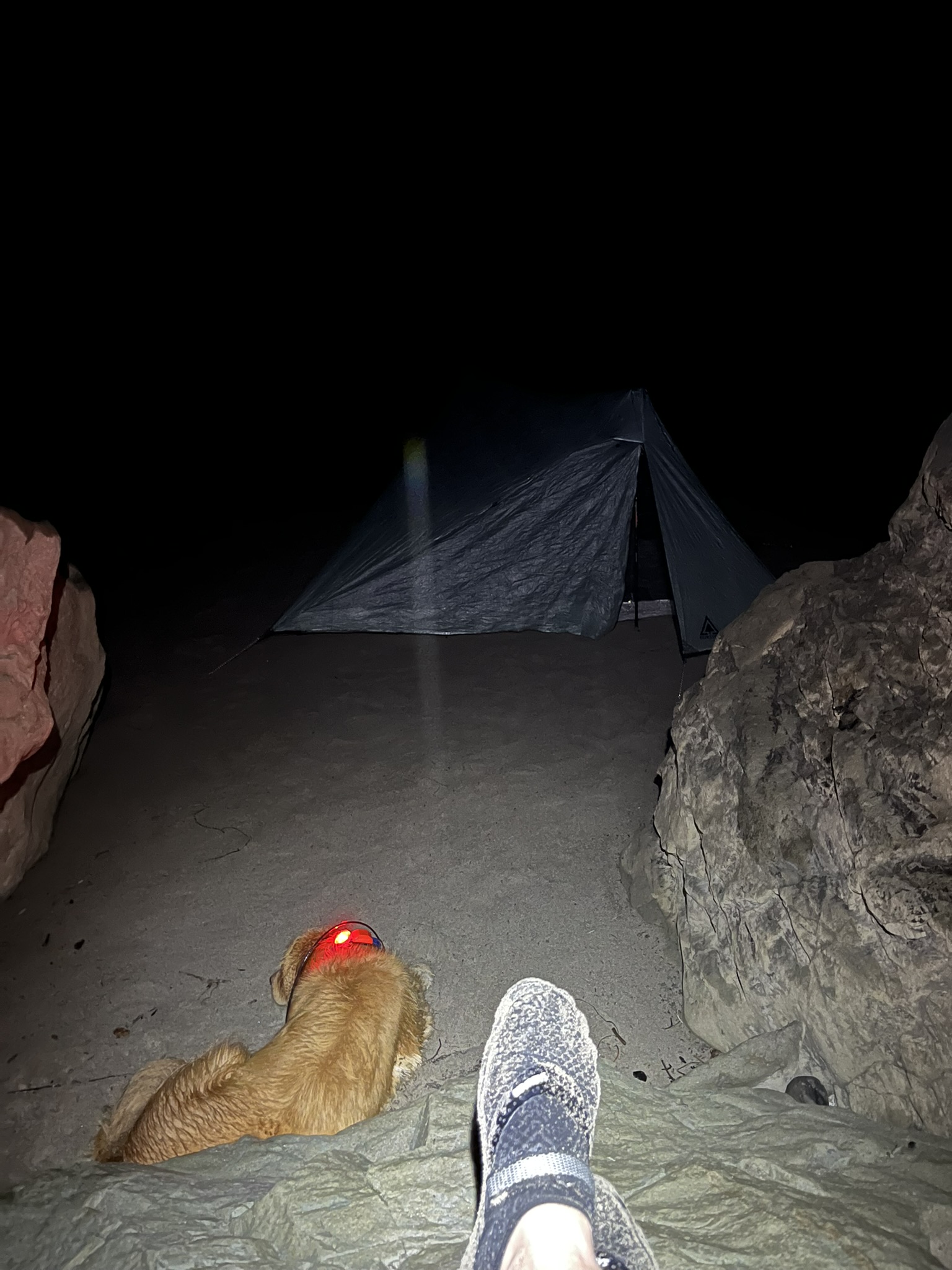 Around 10:30 PM we found a flat patch of sand tucked between boulders near Jefferson Cove. My human set up the tent. I lay on the sand and listened to the waves. The whole beach smelled like salt and exhaustion and somewhere far off, a seal barked.