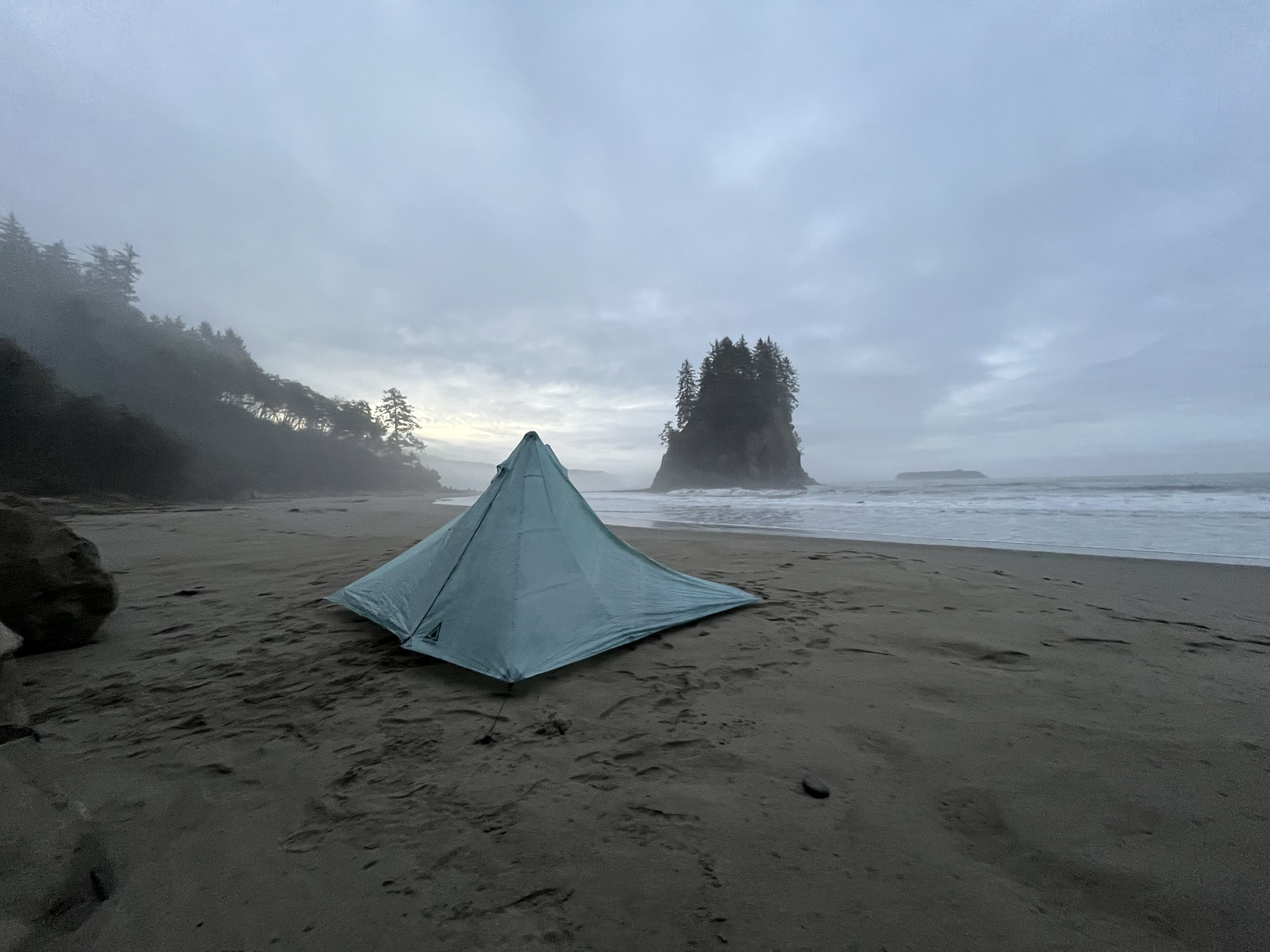 Morning revealed what we'd camped next to. A massive tree-covered sea stack rose from the beach just offshore, dark against the mist. We'd walked right past it in the dark without knowing. The tent sat on gray sand between the stack and the forest, waves breaking in the middle distance. The morning smelled like fog and seaweed and coffee from my human's stove.