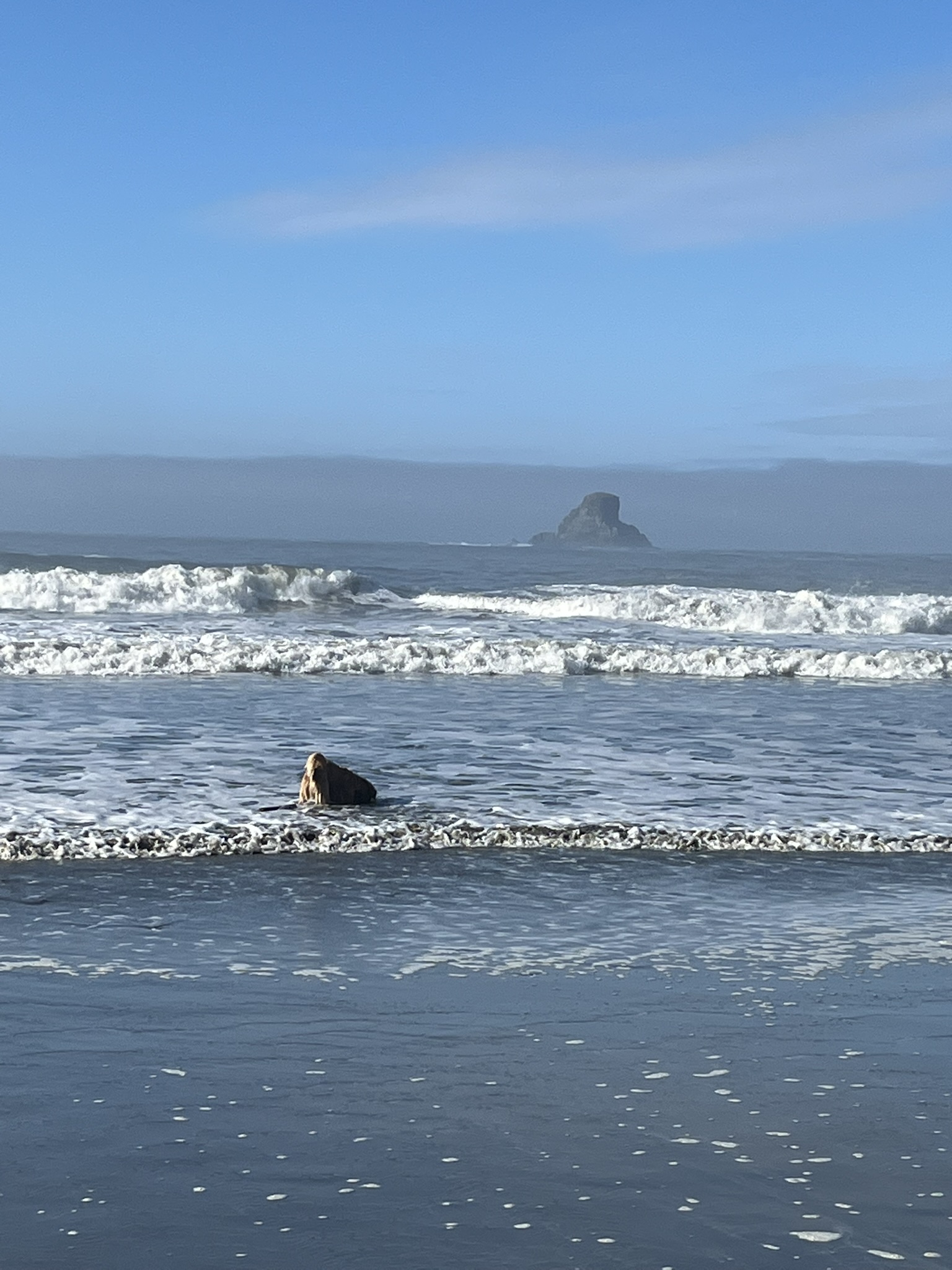 When I finally got up, I went straight for the ocean. The morning had broken into blue sky and the water was right there. I waded in and sat in the shallows — waves crashing around me, a sea stack on the horizon, whitewater foaming at my chest. The Pacific Ocean is cold and enormous and tastes like everything the mountains don't. I sat there and let it hit me.