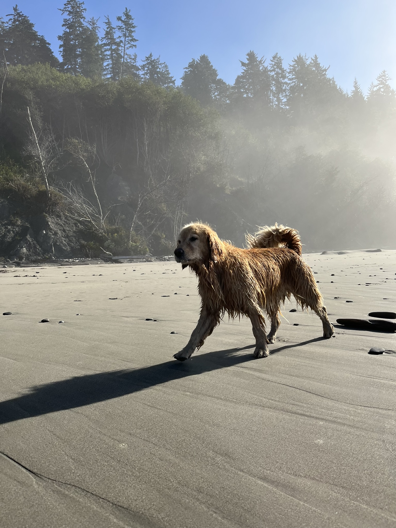 I came out soaking, backlit by the morning sun, and trotted across the flat wet sand with sea mist rising behind me. Golden fur dripping, salt in my coat, totally at home on a beach most dogs will never see. I was made for water and this was more water than I'd ever had.