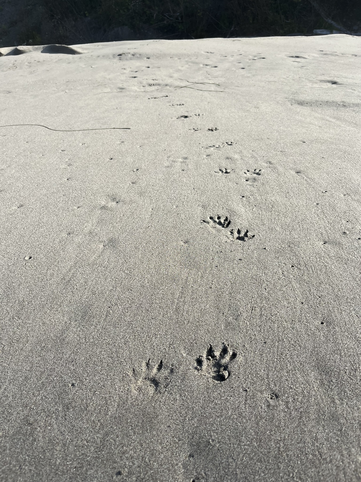 I wasn't the only one who'd been on this beach. A line of small animal tracks — raccoon, probably river otter — trailed across the sand toward the waterline. I followed them with my nose, reading the story. Where they came from, where they went, how long ago. I didn't need to chase anything. The tracks told me everything.