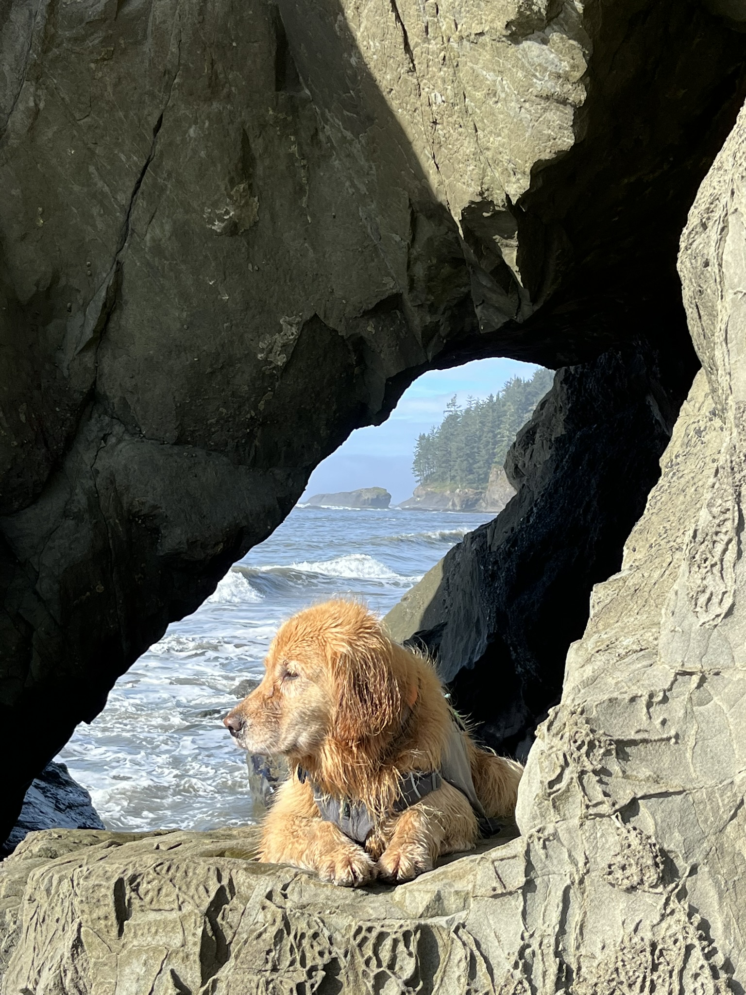 Just north of camp, we found a natural rock arch framing the coastline. I settled into it naturally — smooth stone under me, the ocean and forested headlands framed through the opening. The stone was cool and the light was perfect and the whole scene smelled like warm sandstone and salt. My human took the photo. I wasn't posing. I was resting.