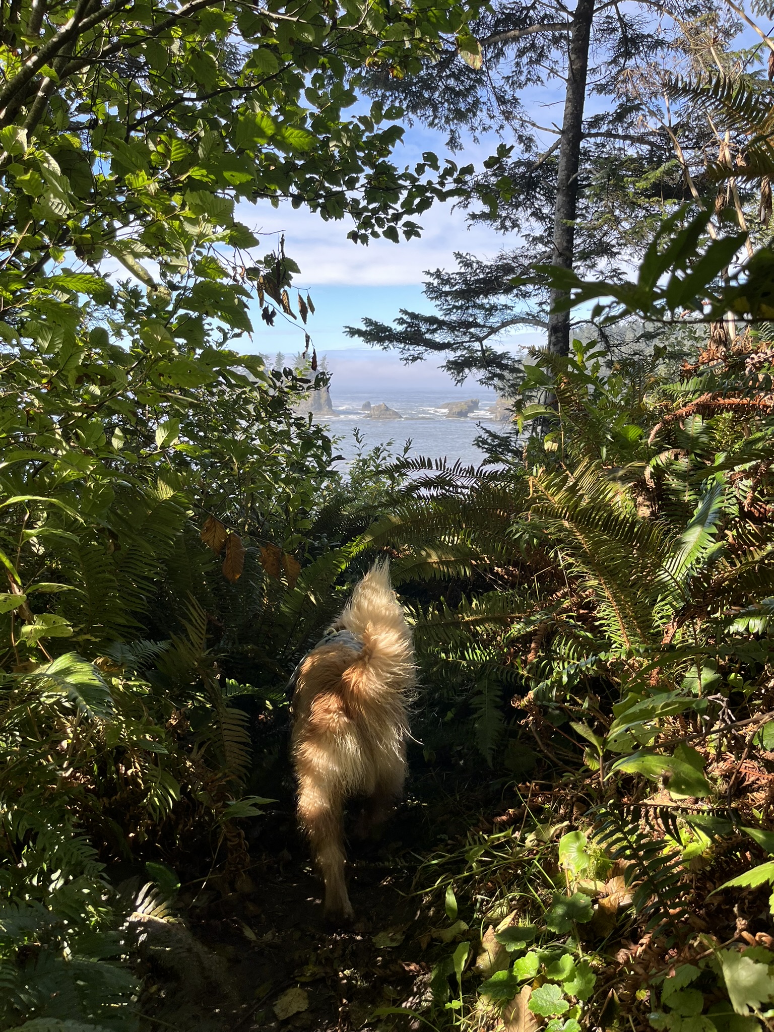 The trail climbed through dense coastal forest — Sitka spruce, sword ferns, ocean visible through gaps in the canopy. Sea stacks appeared far below through the trees. The air was thick with the smell of wet bark and decomposing needles and somewhere underneath it all, the salt of the Pacific.