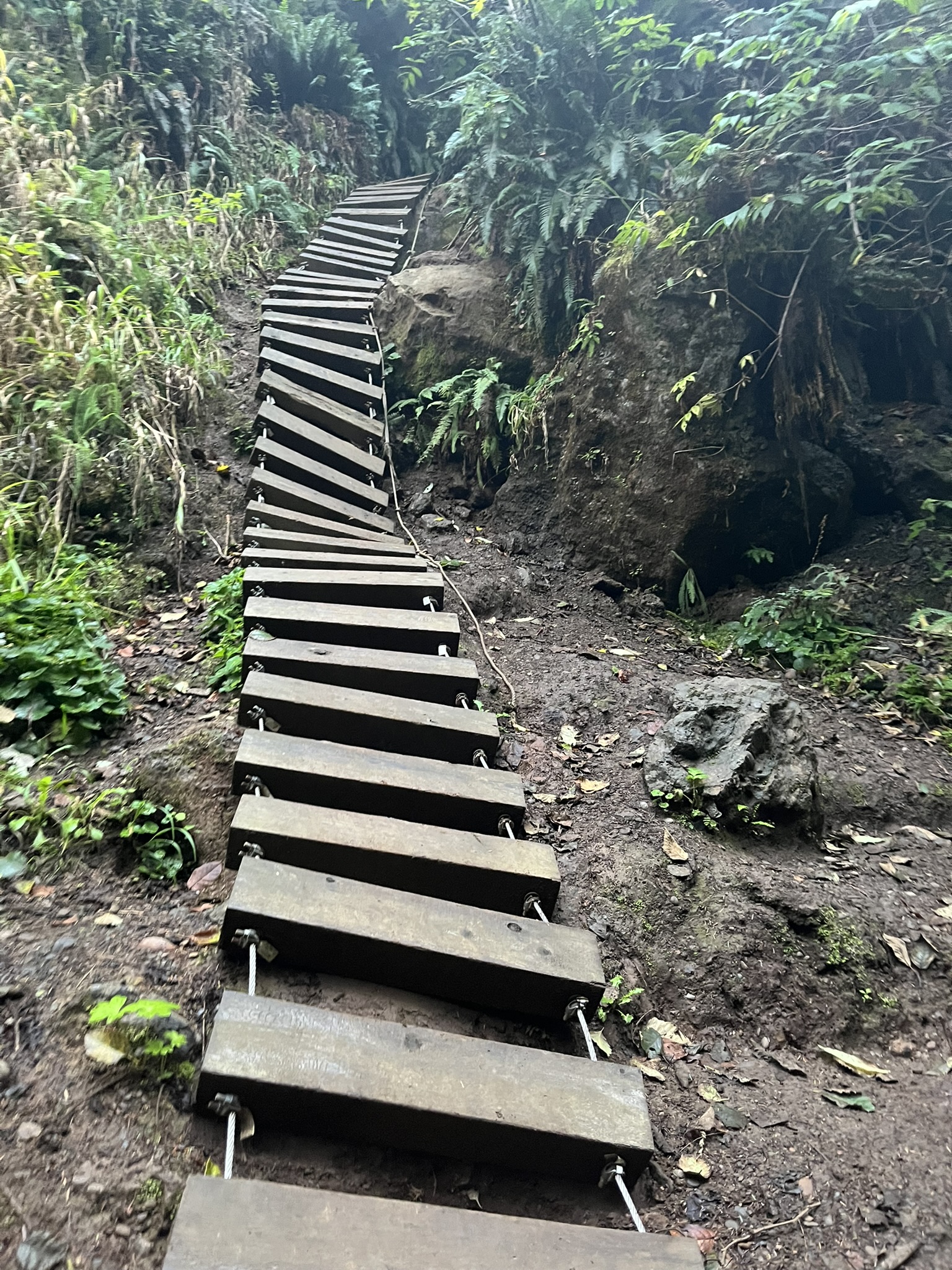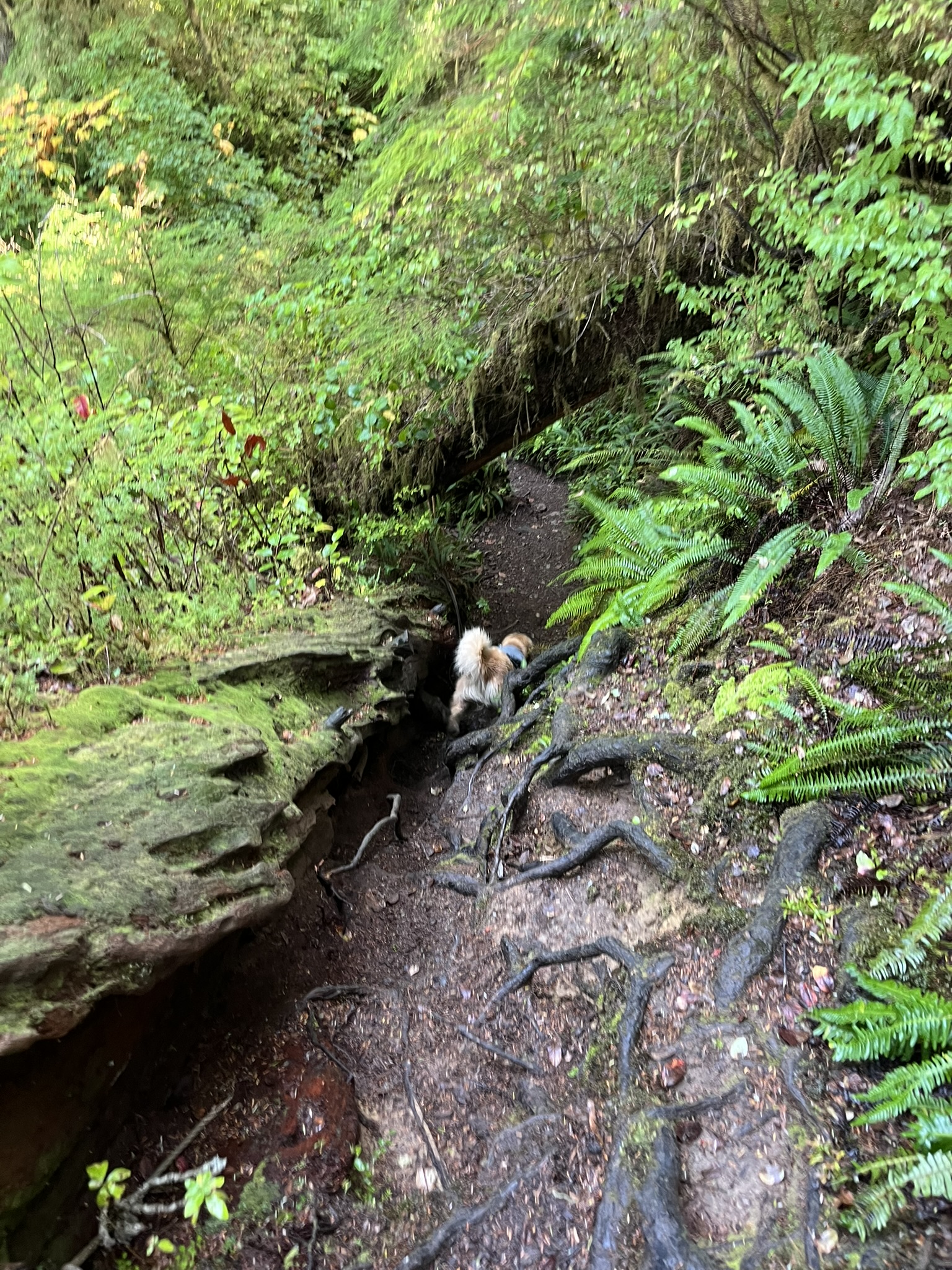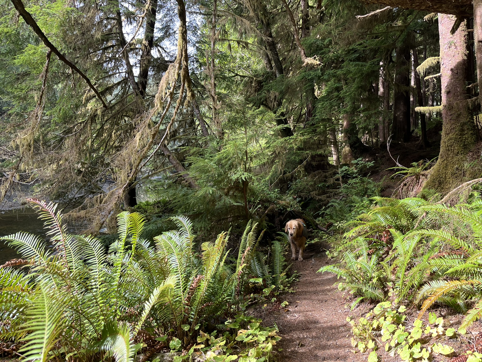 The trail followed the creek upstream through a cathedral of ferns and conifers. Light filtered through the canopy in green columns. The air was cool and still and smelled like another world from the beach.