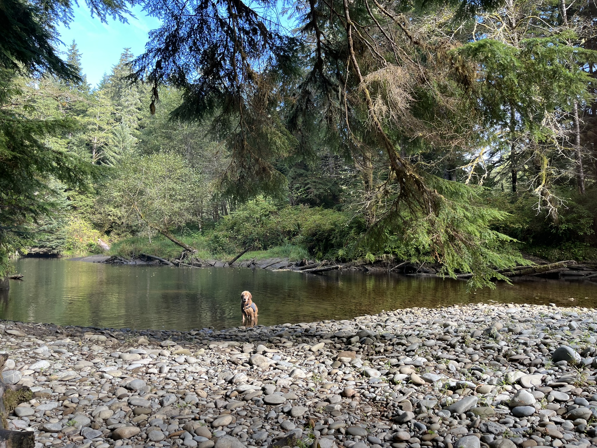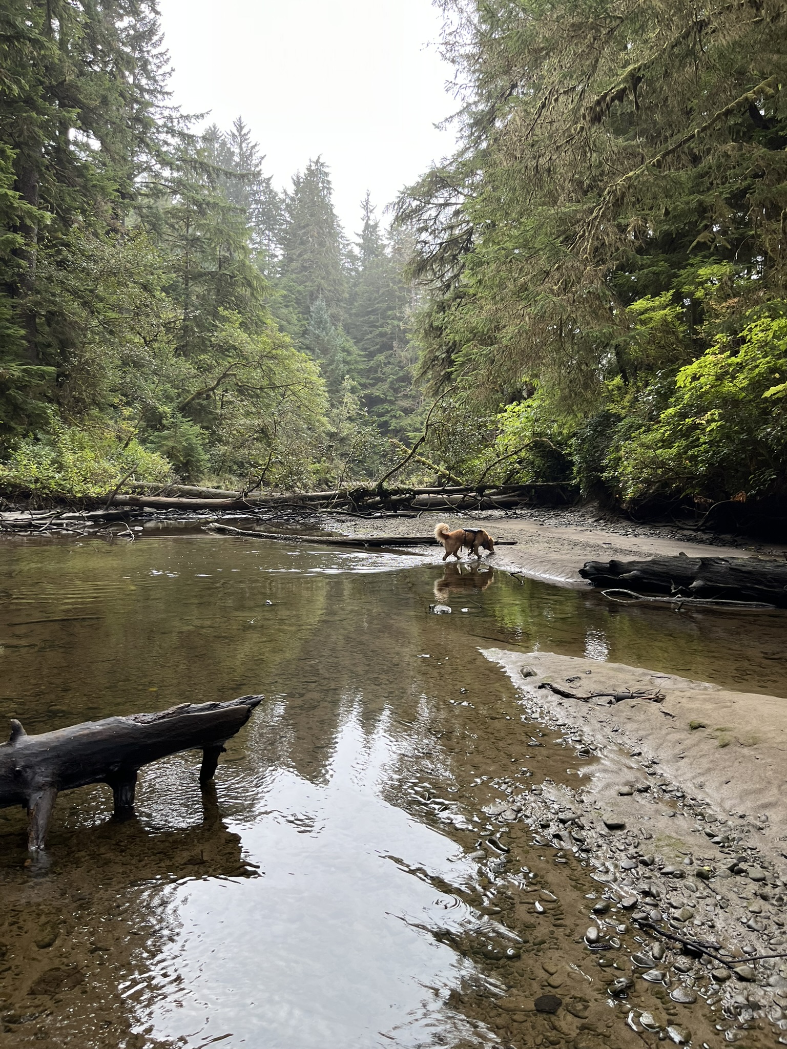The overland trail dropped to a creek crossing. I waded in without hesitation. Clear water flowing over river cobble, old-growth forest reflected on the surface, the kind of creek that tastes like moss and stone and has been running the same way for a thousand years. After the salt of the ocean, the fresh water tasted like the best thing I'd ever put my mouth in.