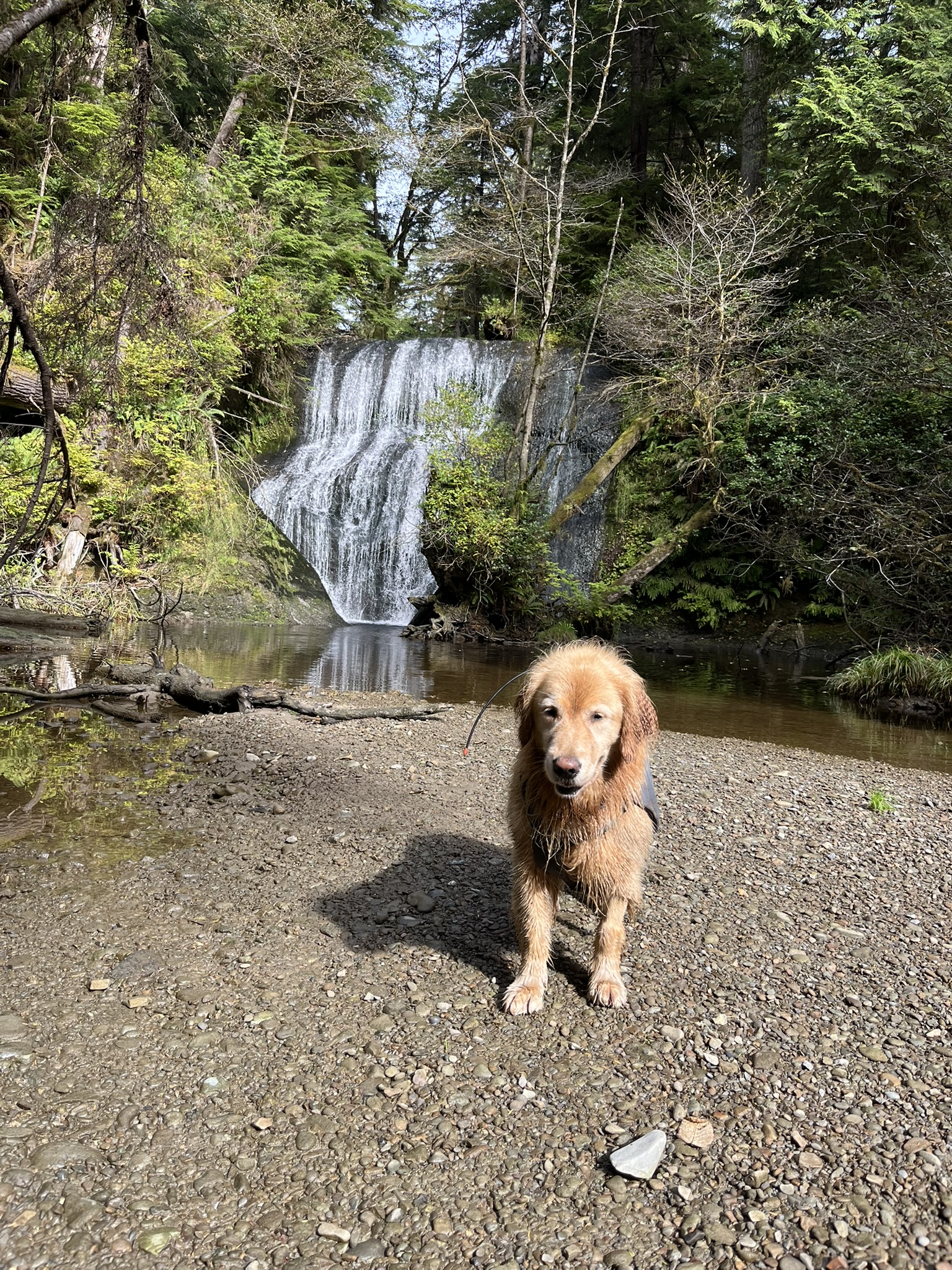 Then we hit the waterfall. A wide cascade pouring over a rock shelf into a dark pool, framed by moss and ferns. I stood at the base and looked up at it. I have seen a lot of mountains. I had not seen many waterfalls. The sound filled my whole chest and the mist settled on my fur and I stood there longer than I needed to.