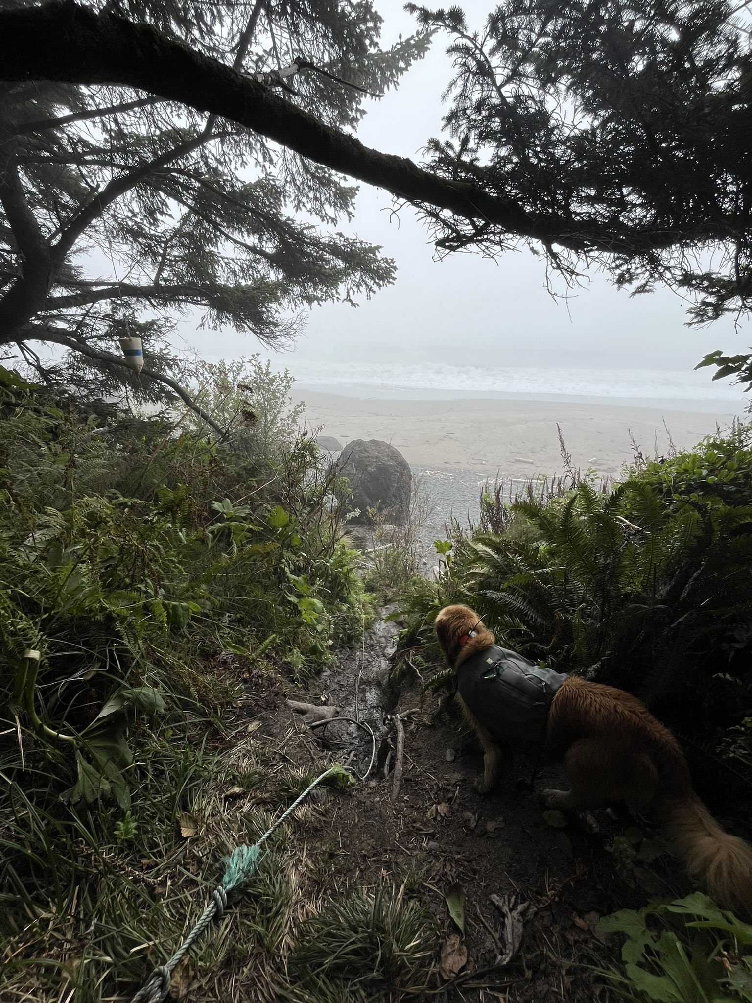 The overland trail climbed through misty forest before dropping back to the beach. I led the way in my pack, disappearing up a fern-lined trail into the fog. The transition between forest and ocean is something I felt before I saw — the air changed, the humidity shifted, the salt returned.