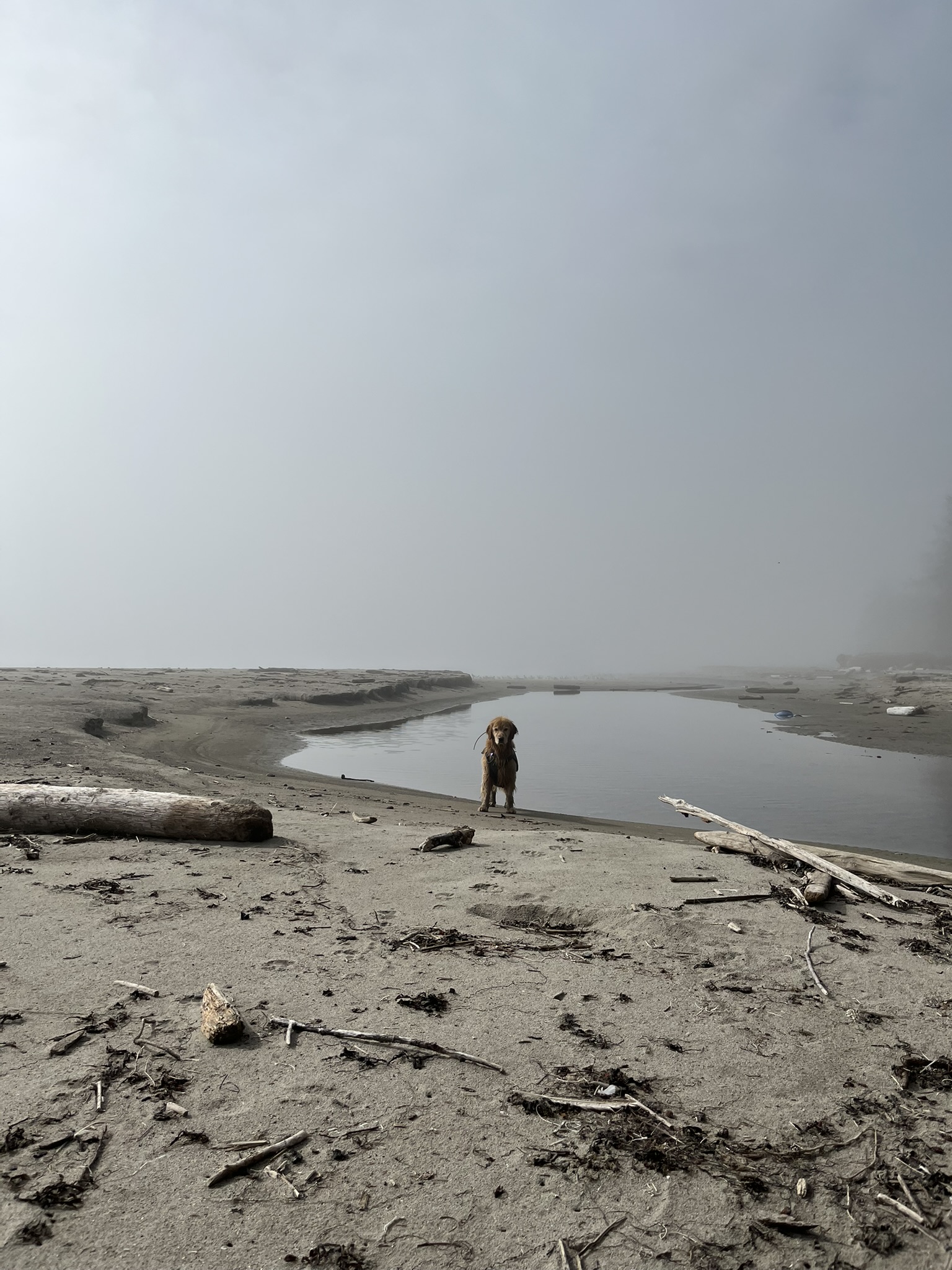 A creek mouth cut across the sand and I stood alone on the flat — the only living thing in a landscape of fog and driftwood stretching in every direction. I could hear waves but couldn't see where they ended.